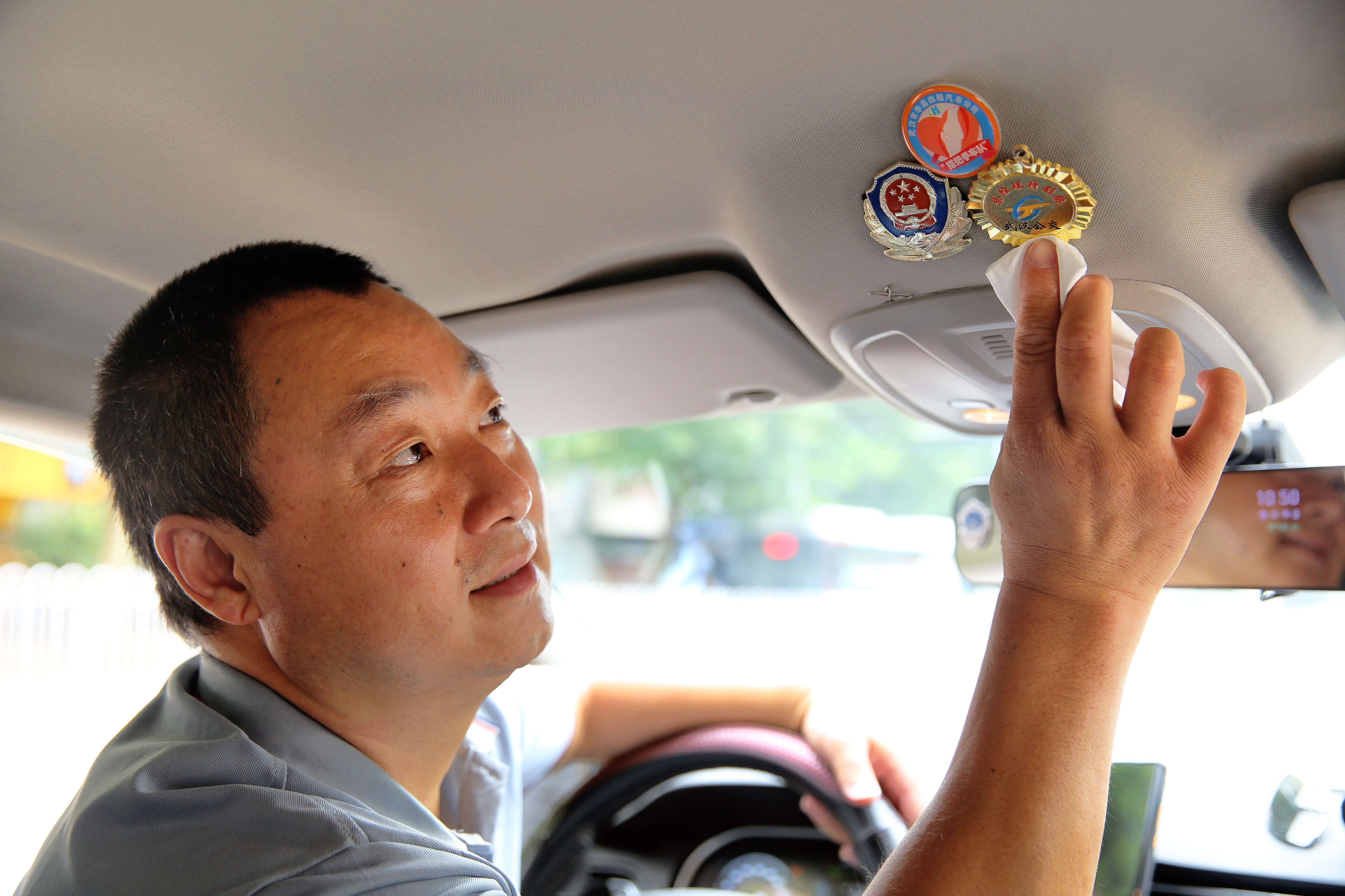 陈万青每天都要将挂在车里的荣誉勋章反复擦拭。张宁 摄