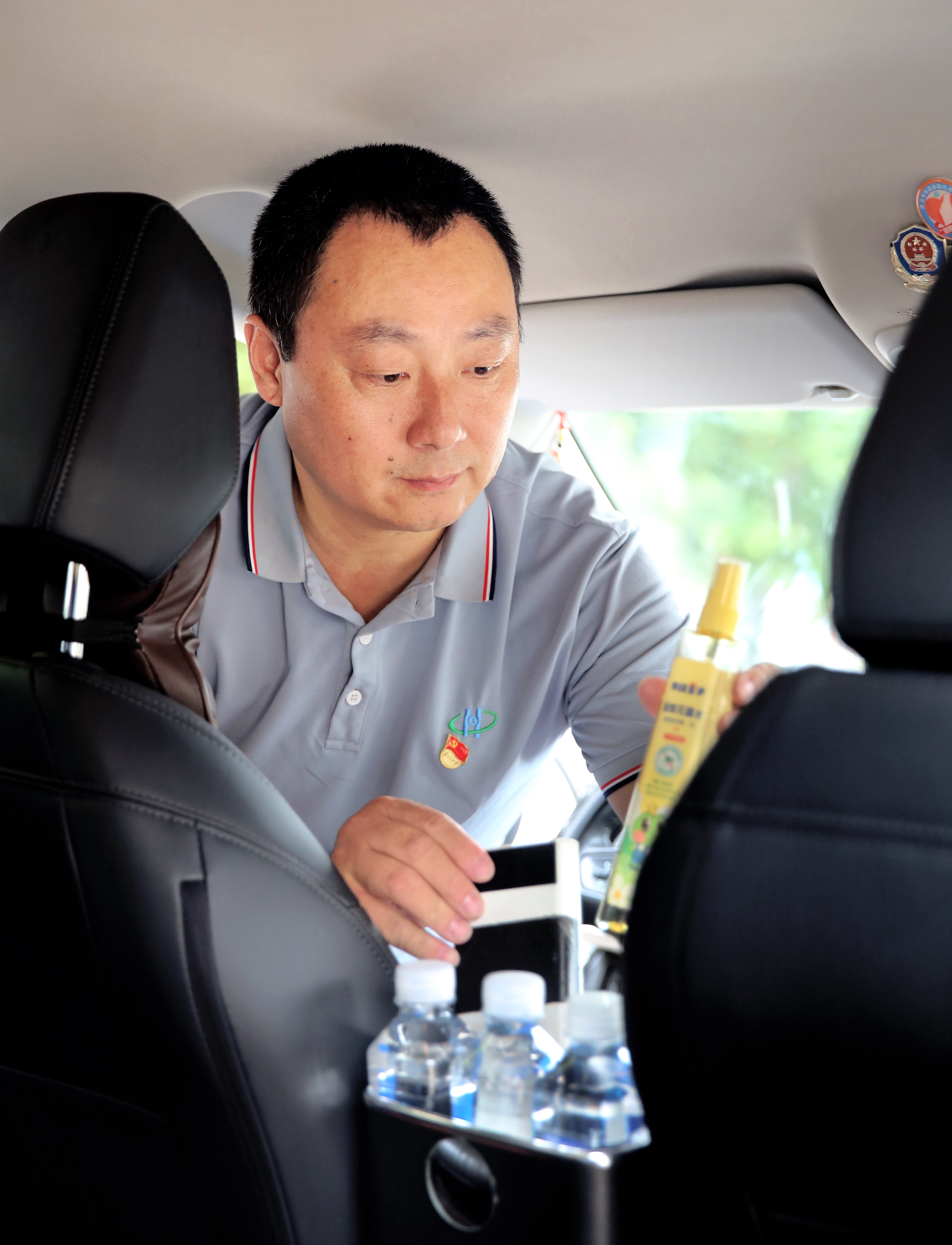 陈万青准备将几瓶矿泉水放置在车内各角落。 张宁 摄
