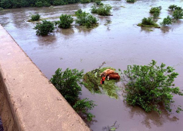 消防员赶到现场后侦查发现,一名男子牵着四头牛被困于河道中间的一处浅滩上,现场位置地形复杂,水面宽阔,水流湍急,男子被困的浅滩距离岸边较远,营救难度较大。而此时,水位继续上涨,随着时间一秒一秒过去,情况也越来越紧急。