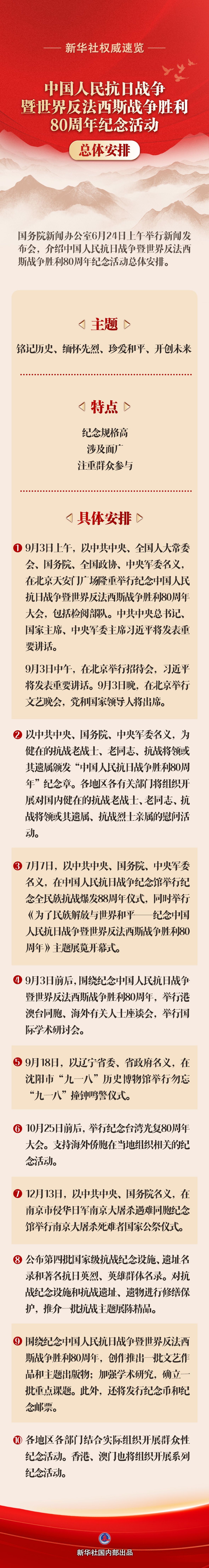 一图读懂:中国人民抗日战争暨世界反法西斯战争胜利80周年纪念活动总体安排 2025-06-24 14:22 新华社 0 国务院新闻办公室6月24日上午举行新闻发布会,介绍中国人民抗日战争暨世界反法西斯战争胜利80周年纪念活动总体安排。这次纪念活动有哪些具体安排?一起来看↓ (来源:新华社) 【编辑:陈明】