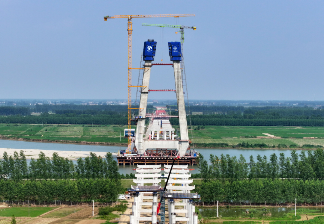 国内最大跨径无辅助墩组合梁独塔斜拉桥——武荆宜高速汉江特大桥施工现场。图片来源荆门交通、朱俊波、吴健
