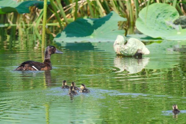 在豹澥湖虾塘遛娃的青头潜鸭。王若虚 摄