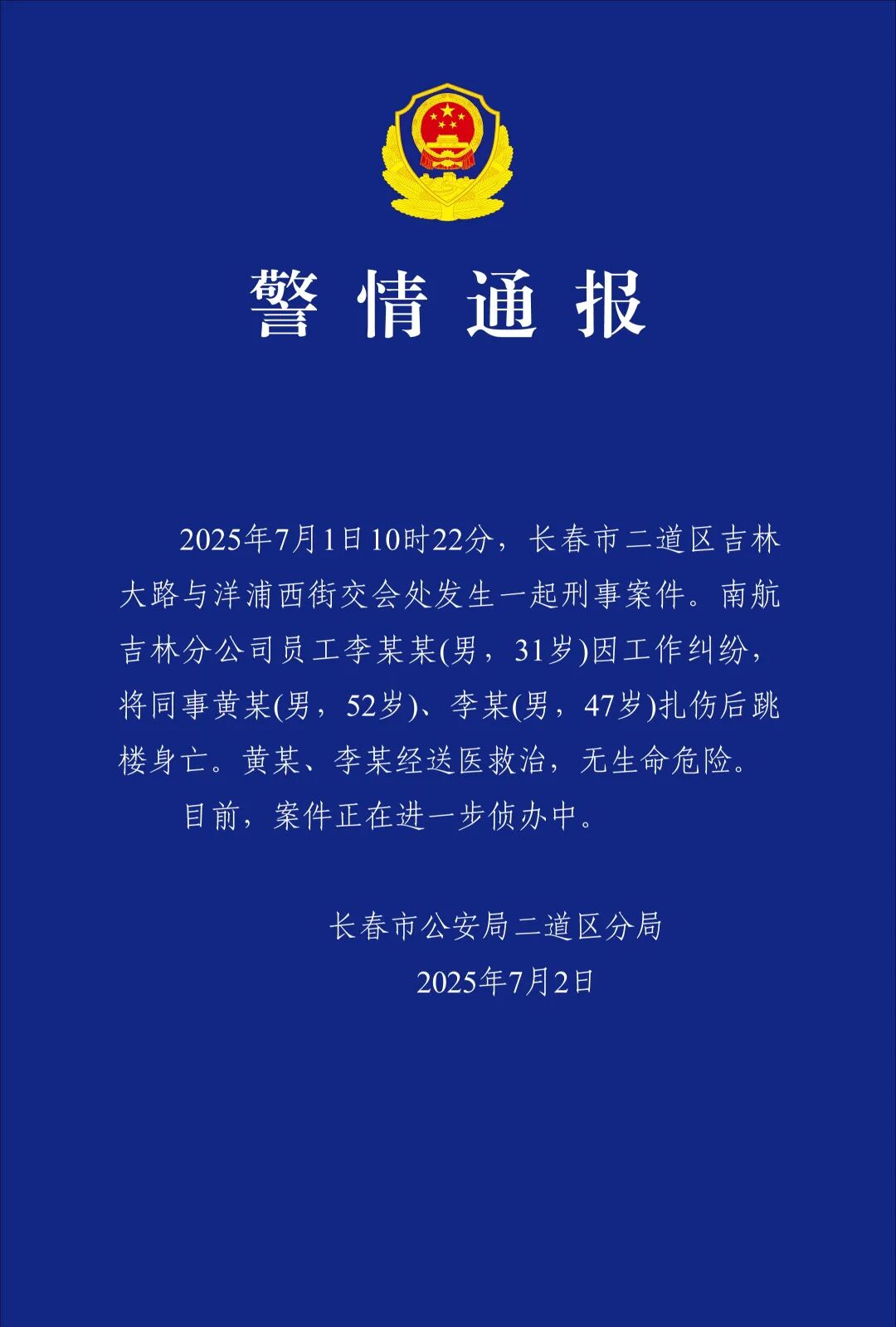 2025年7月1日10时22分,长春市二道区吉林大路与洋浦西街交会处发生一起刑事案件。南航吉林分公司员工李某某(男,31岁)因工作纠纷,将同事黄某(男,52岁)、李某(男,47岁)扎伤后跳楼身亡。黄某、李某经送医救治,无生命危险。目前,案件正在进一步侦办中。