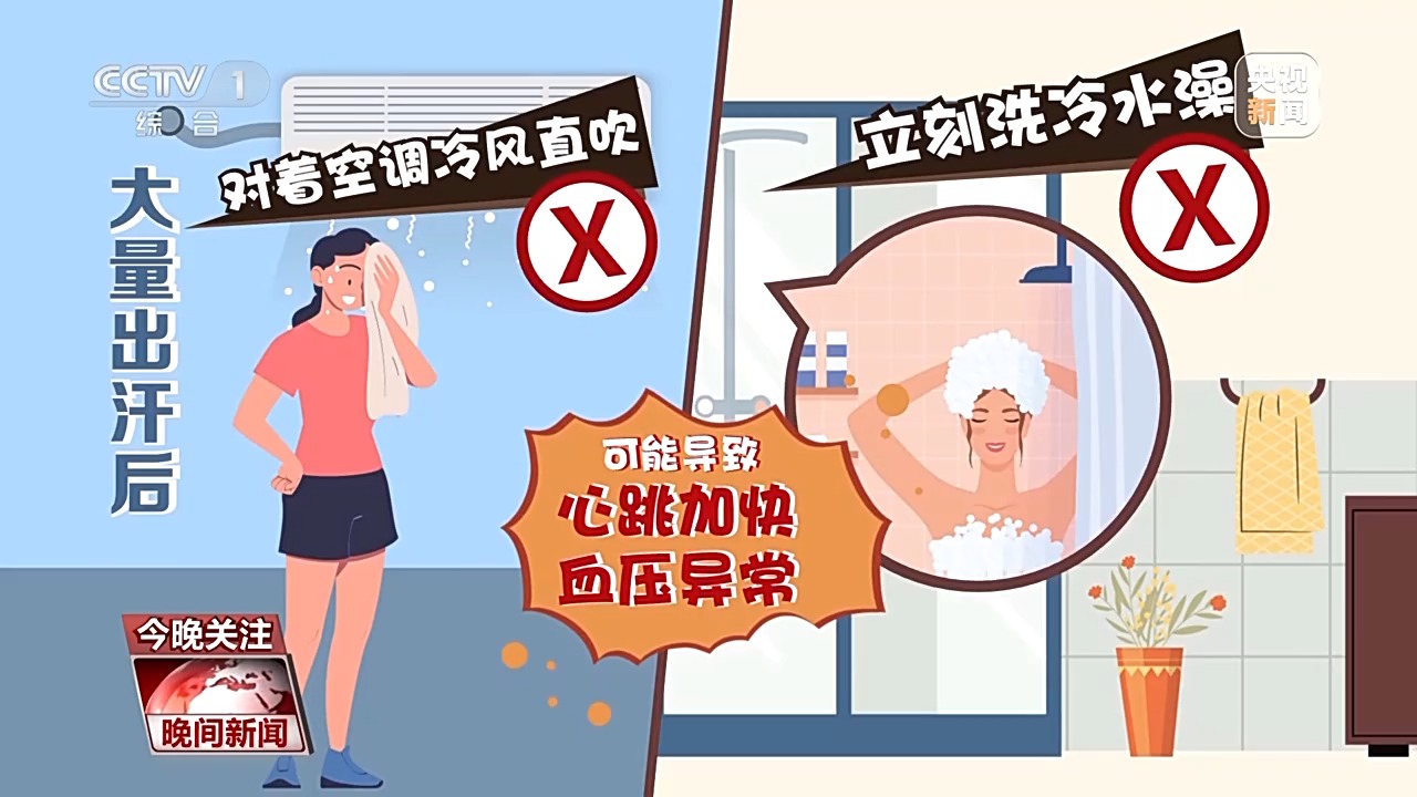 此外专家表示,在大量出汗后不宜对着空调冷风直吹,也不宜立刻洗澡,尤其不宜洗冷水澡,这可能会导致心跳加快和血压异常。