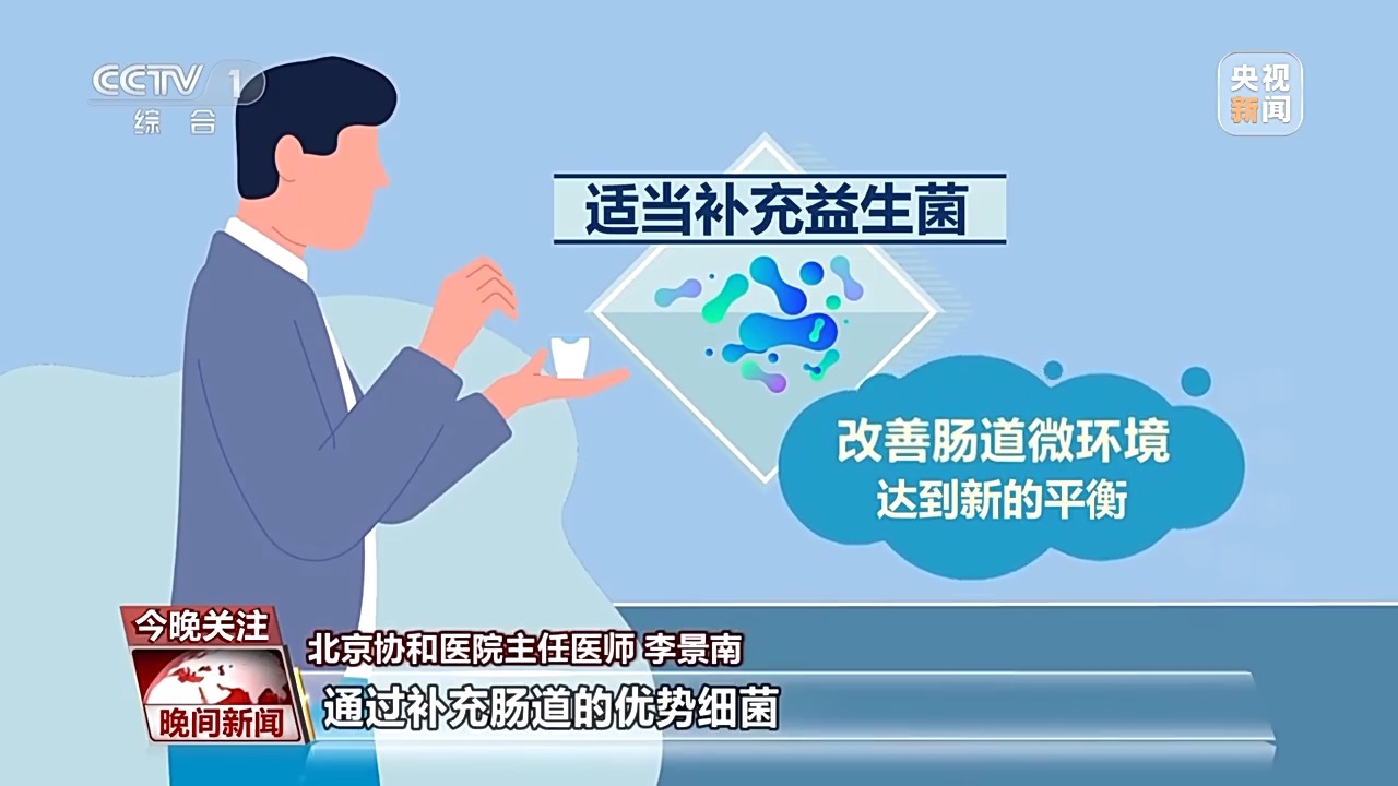 北京协和医院主任医师 李景南:通过补充肠道的优势细菌,包括双歧杆菌、乳杆菌,可以调节微生物平衡,抑制有害菌的生长。但是益生菌也不是万能的,比如食物中毒,或者是特殊的细菌包括痢疾杆菌引起的腹泻,这时候单用益生菌效果并不好,需要辅助给抗生素的治疗。