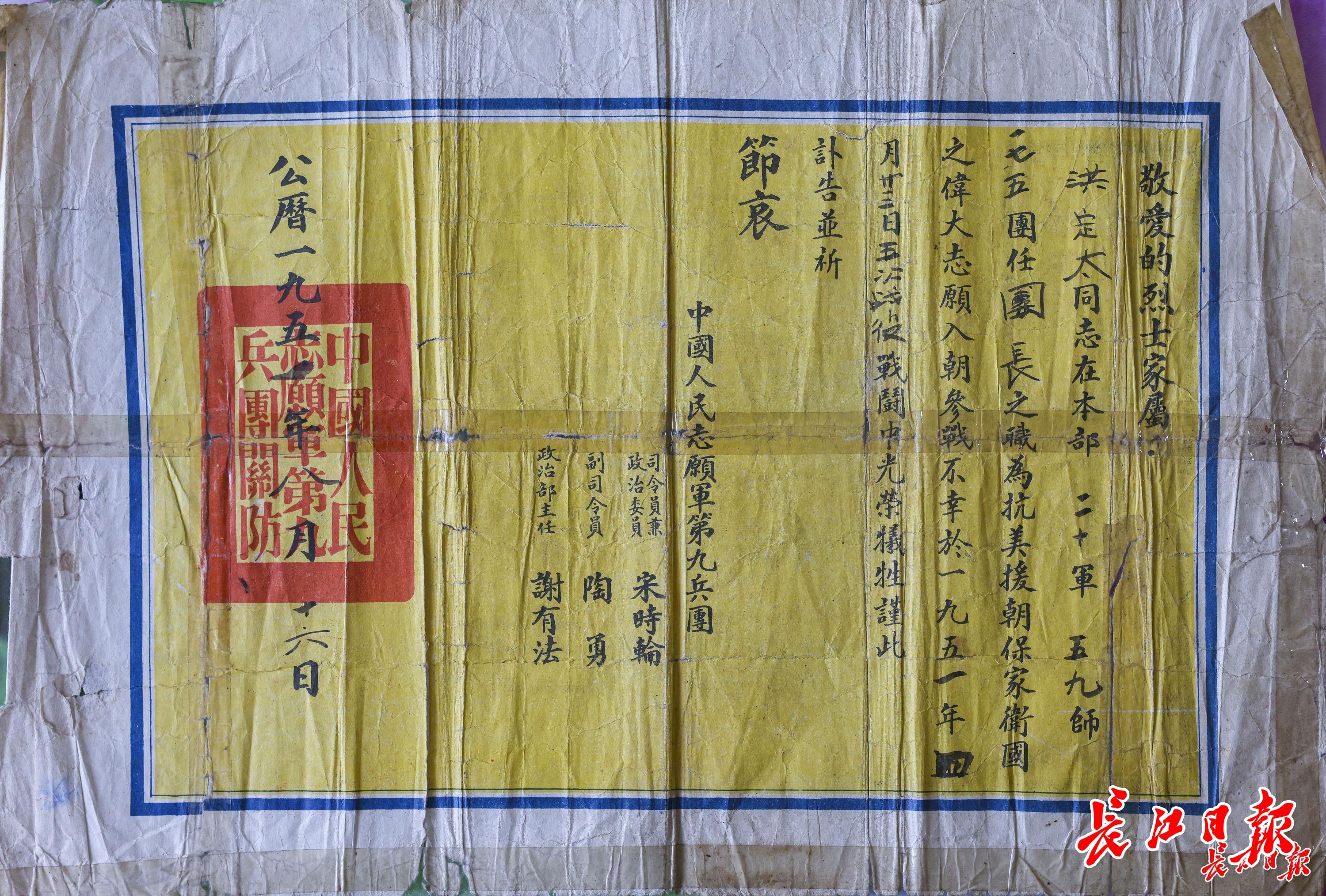 洪定泰参加抗美援朝作战英勇牺牲的相关证明。1951年4月27日傍晚,美机轰炸一七五团指挥部附近运粮的汽车,洪定泰现场指挥时不幸牺牲。记者胡冬冬 摄