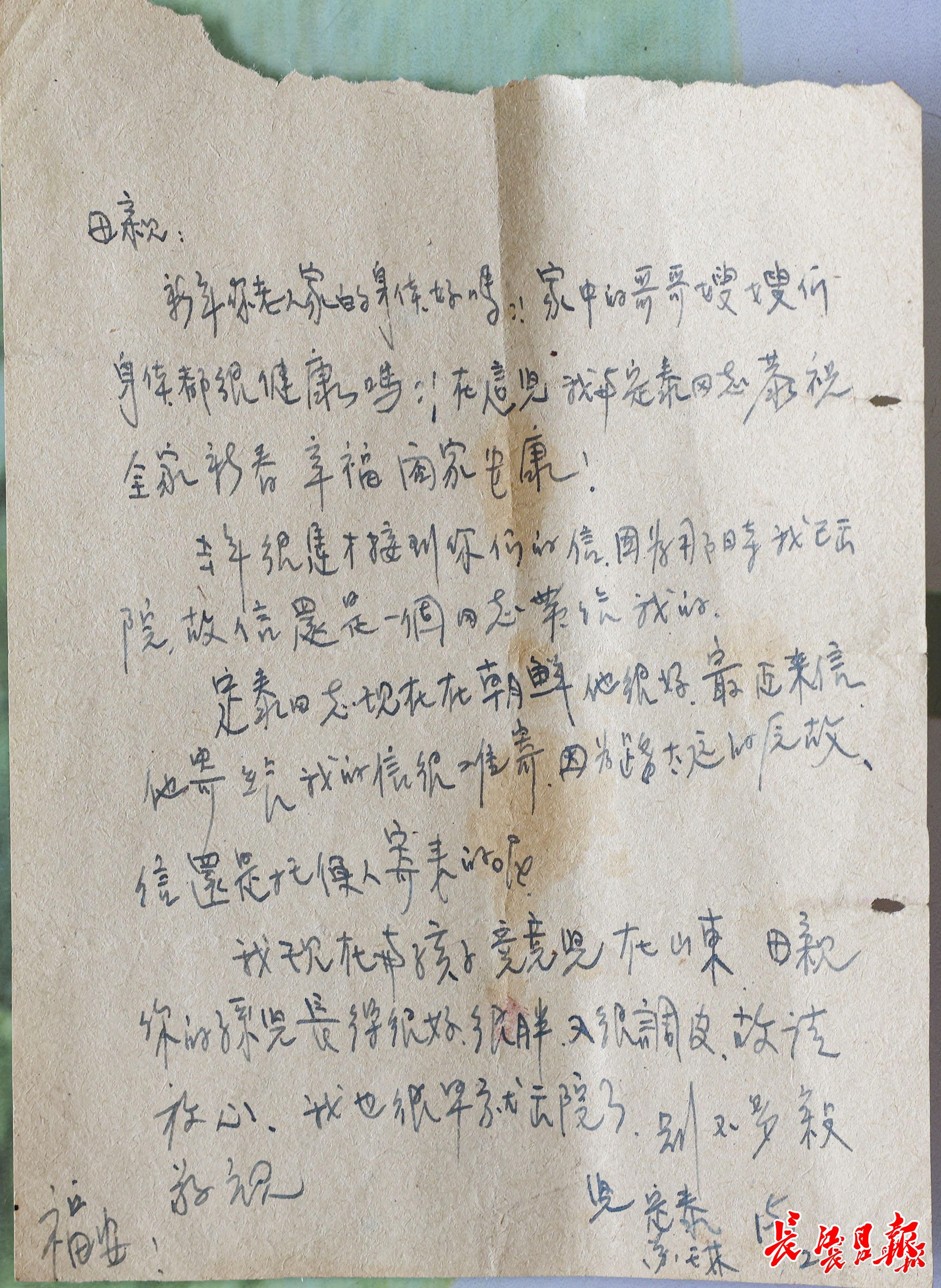 在这些家书中,记者看到这样一封信:“定泰同志现在在朝鲜,他很好,最近来信(说)他寄给我的信很难寄,因为路太远的原(缘)故。信还是托便(别)人寄来的呢。我现在与孩子竞竞是在山东,母亲你的孙儿长得很好,很胖,又很调皮,故请放心,我也很早就出院了……”