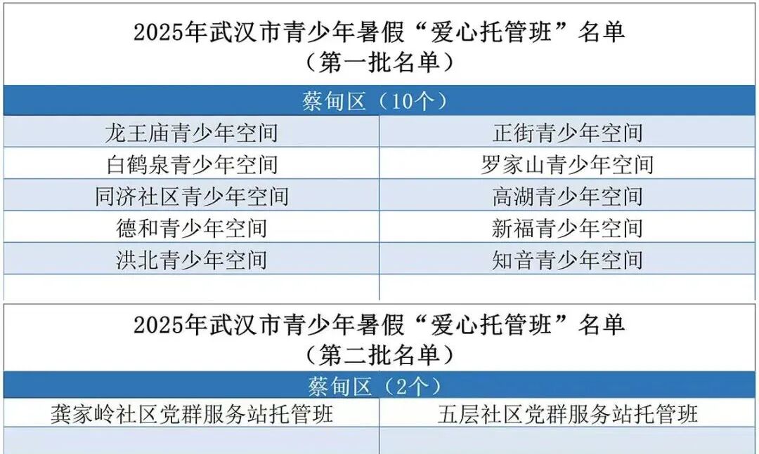据悉,今年蔡甸区暑假“爱心托管班”提质扩面,共分为两个批次。首批10个青少年空间(龙王庙、白鹤泉、正街、同济、德和、新福、高湖、罗家山、洪北、知音),托管时间从7月7日至7月25日;第二批龚家岭、五层社区2个托管班,将于7月28日开班,持续至8月15日。