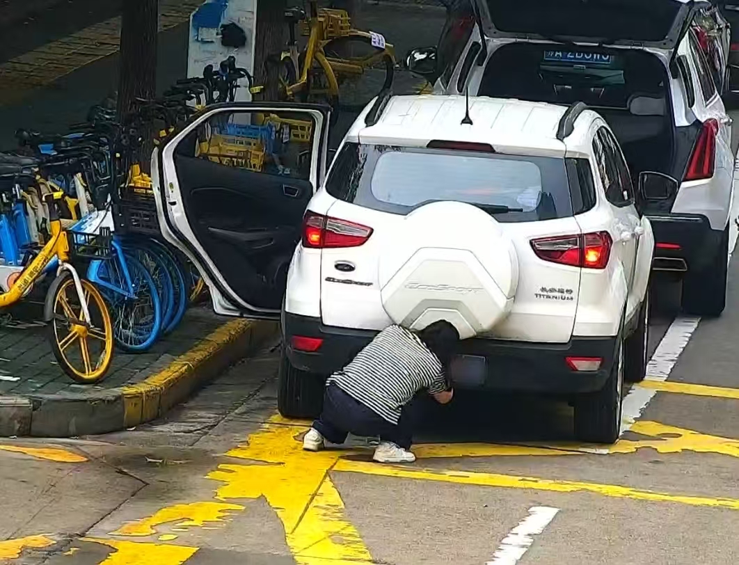 街头监控拍下涉牌违法嫌疑人正在车牌上“动手脚”的画面。