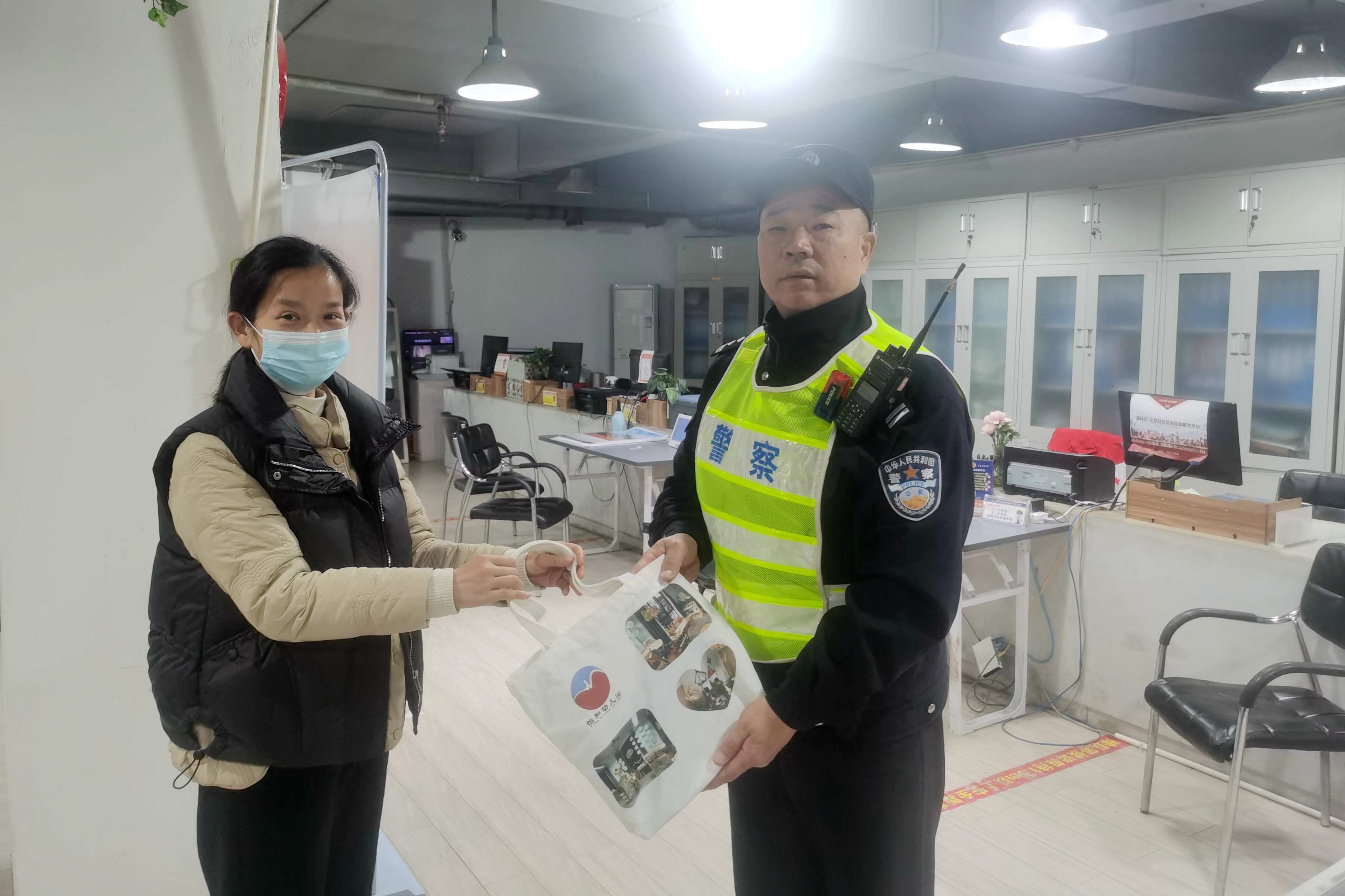 百步亭派出所社区民警沈胜文(右)与“百步义警”成员李丽娜(左)找回代琛女儿的帆布袋。通讯员唐时杰 摄