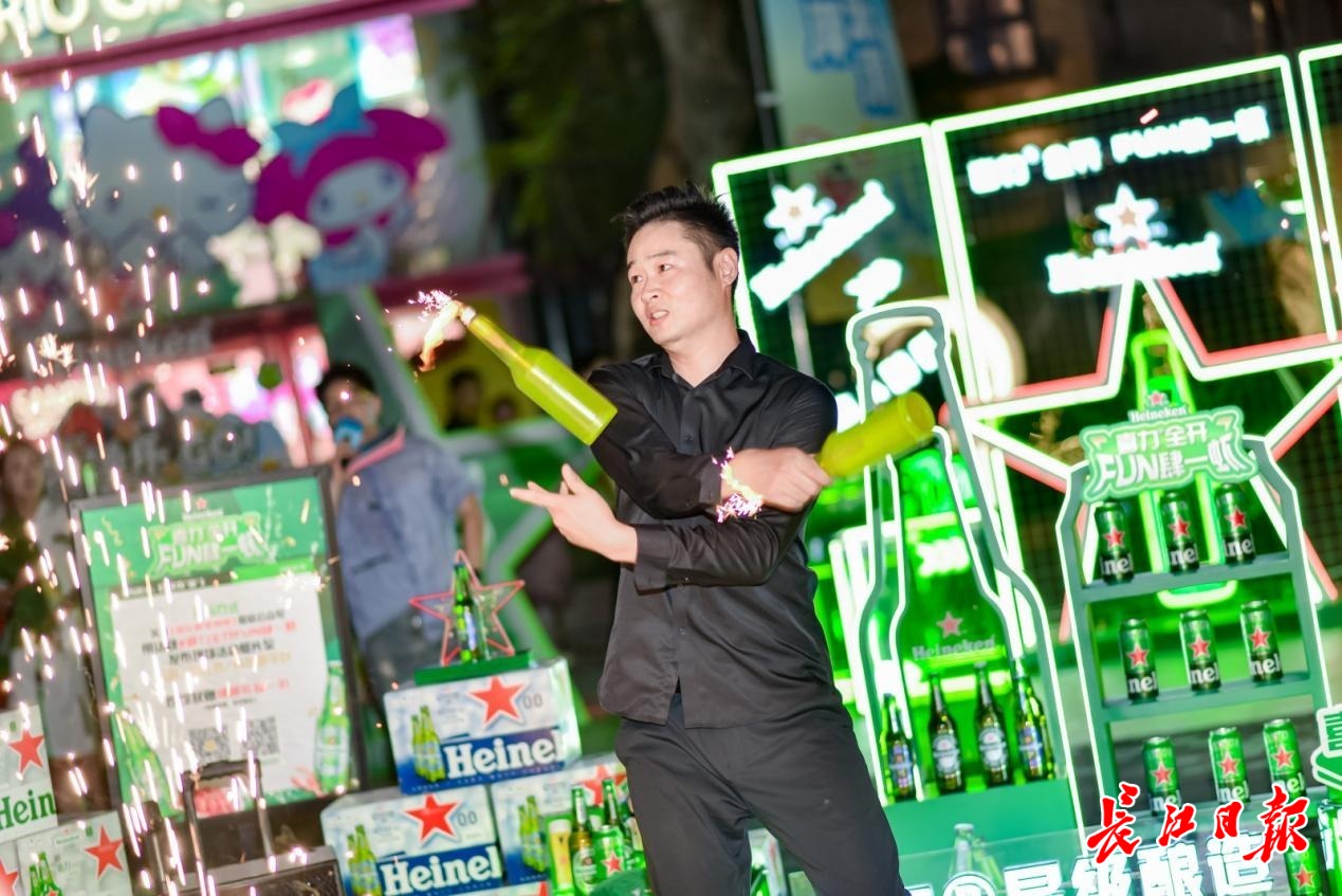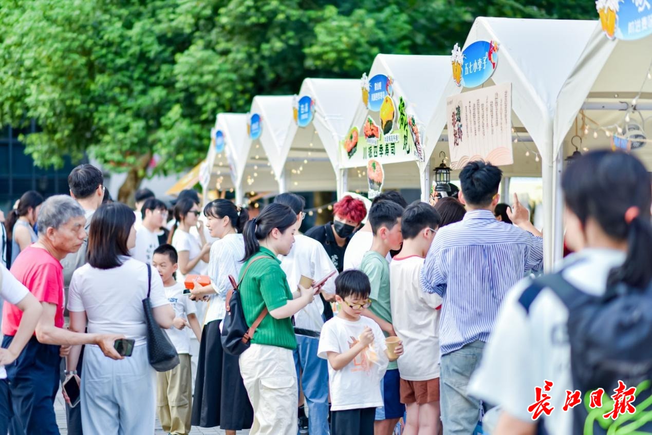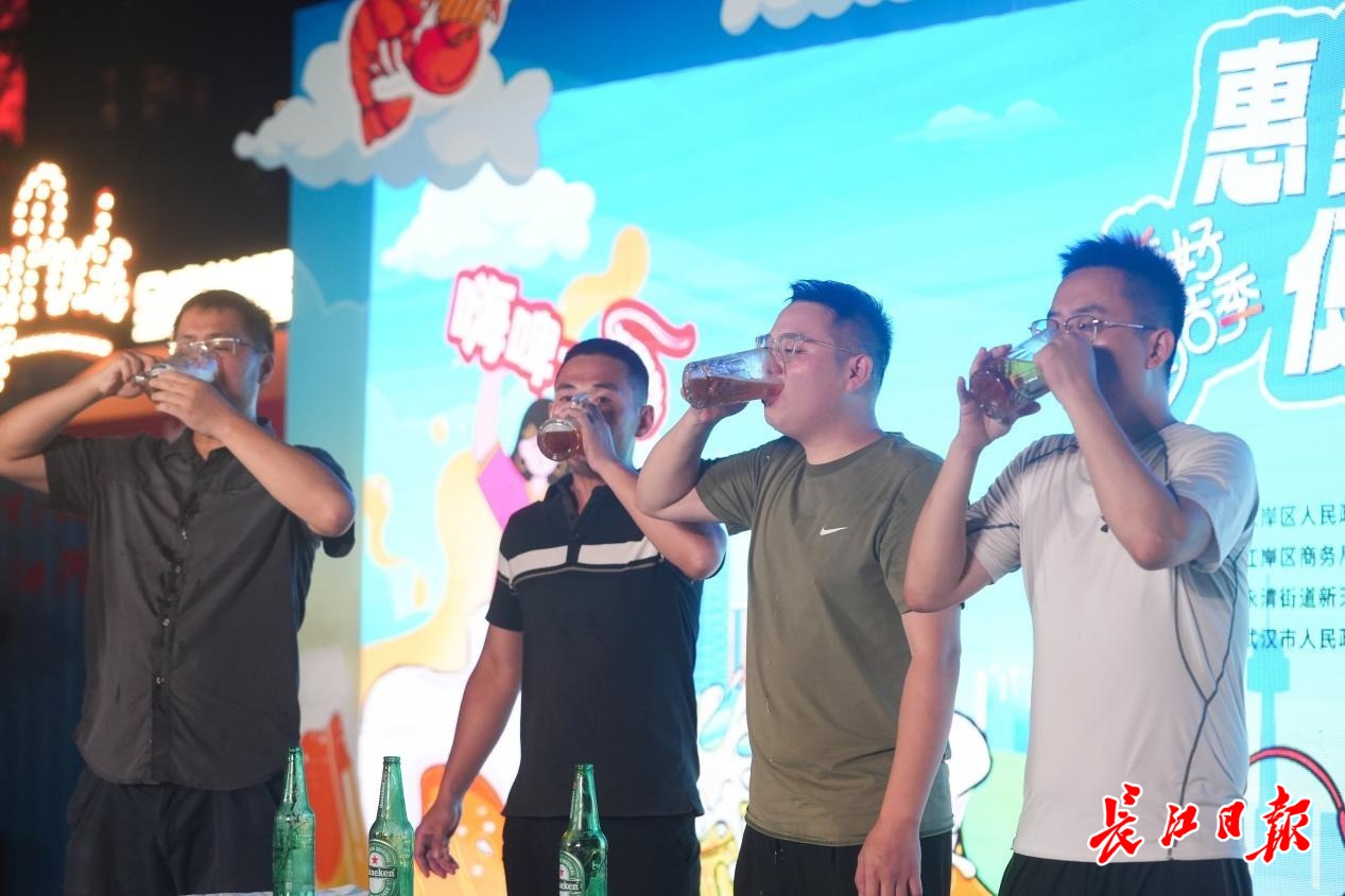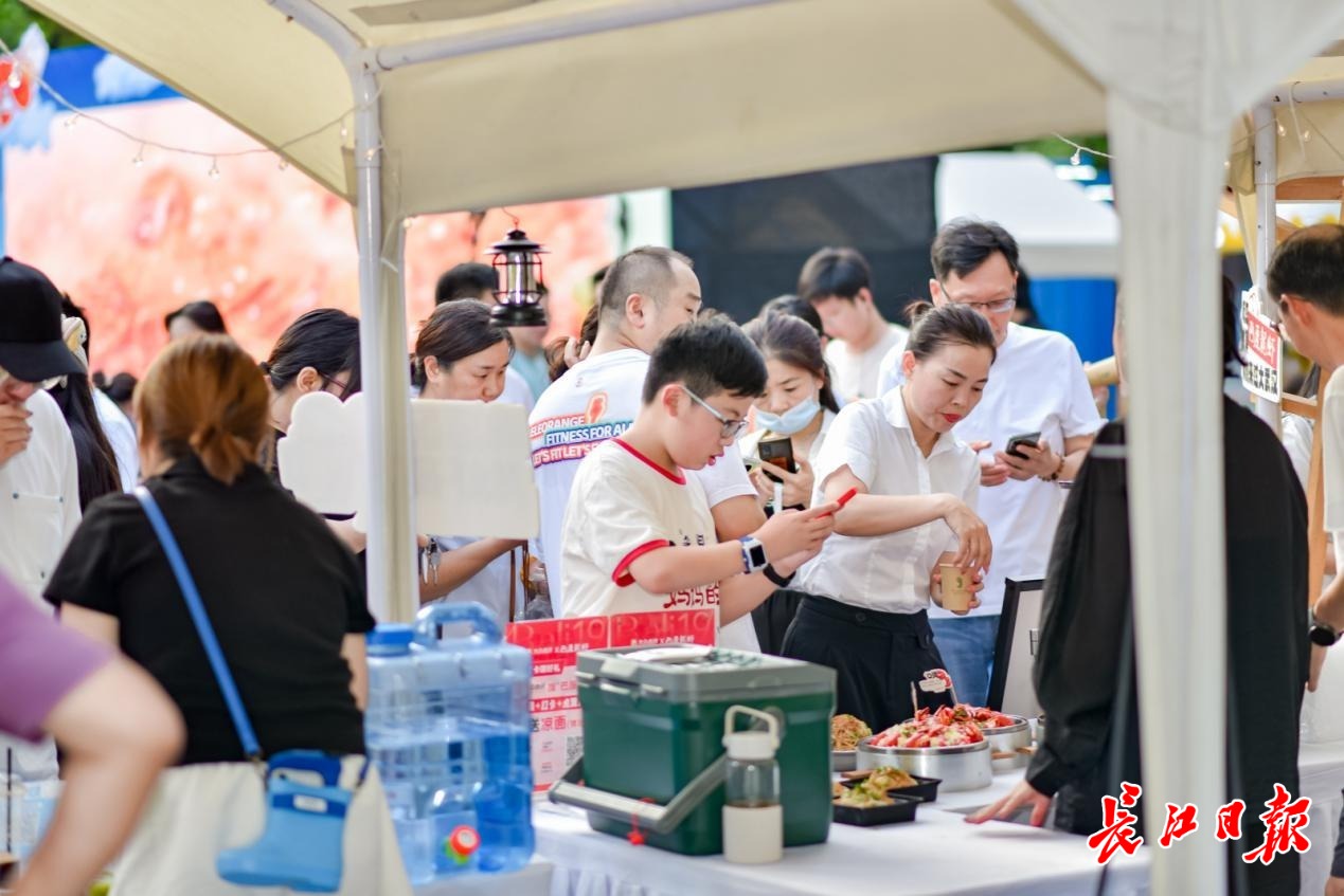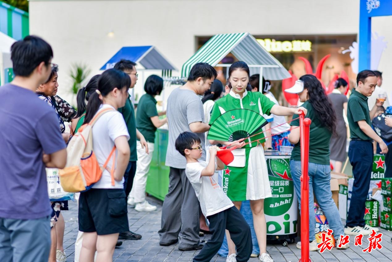 “武汉的夏天,啤酒配着油焖大虾才够味!”傍晚6点,家住江岸区永清街道新天地社区李女士刚在巴厘龙虾的展位品尝完大虾,又被雪花啤酒的“微醺派对”包围。她举着手机拍下热闹的人群,发送到小区微信群里:“快下楼,今晚又有好玩的活动!”