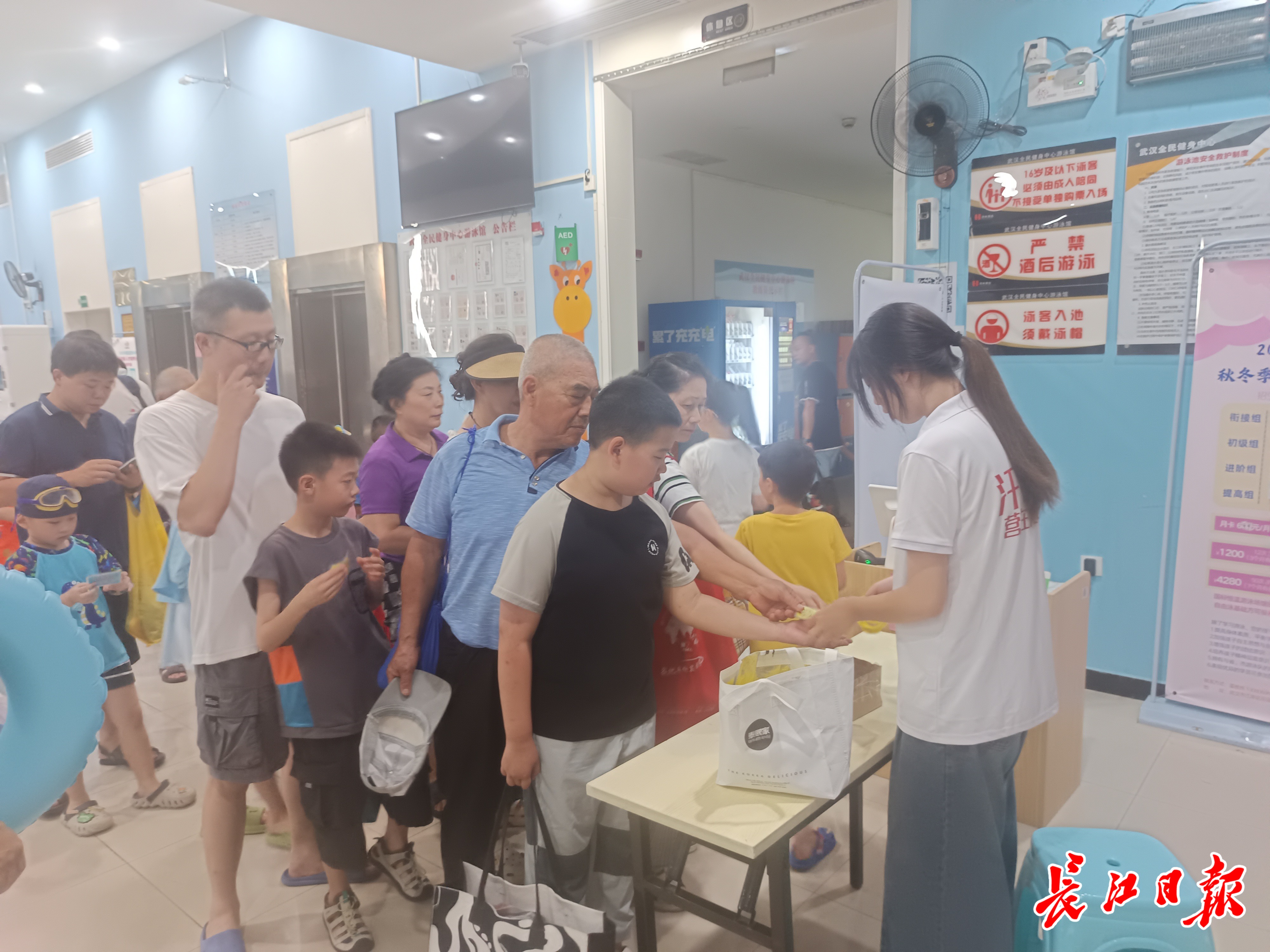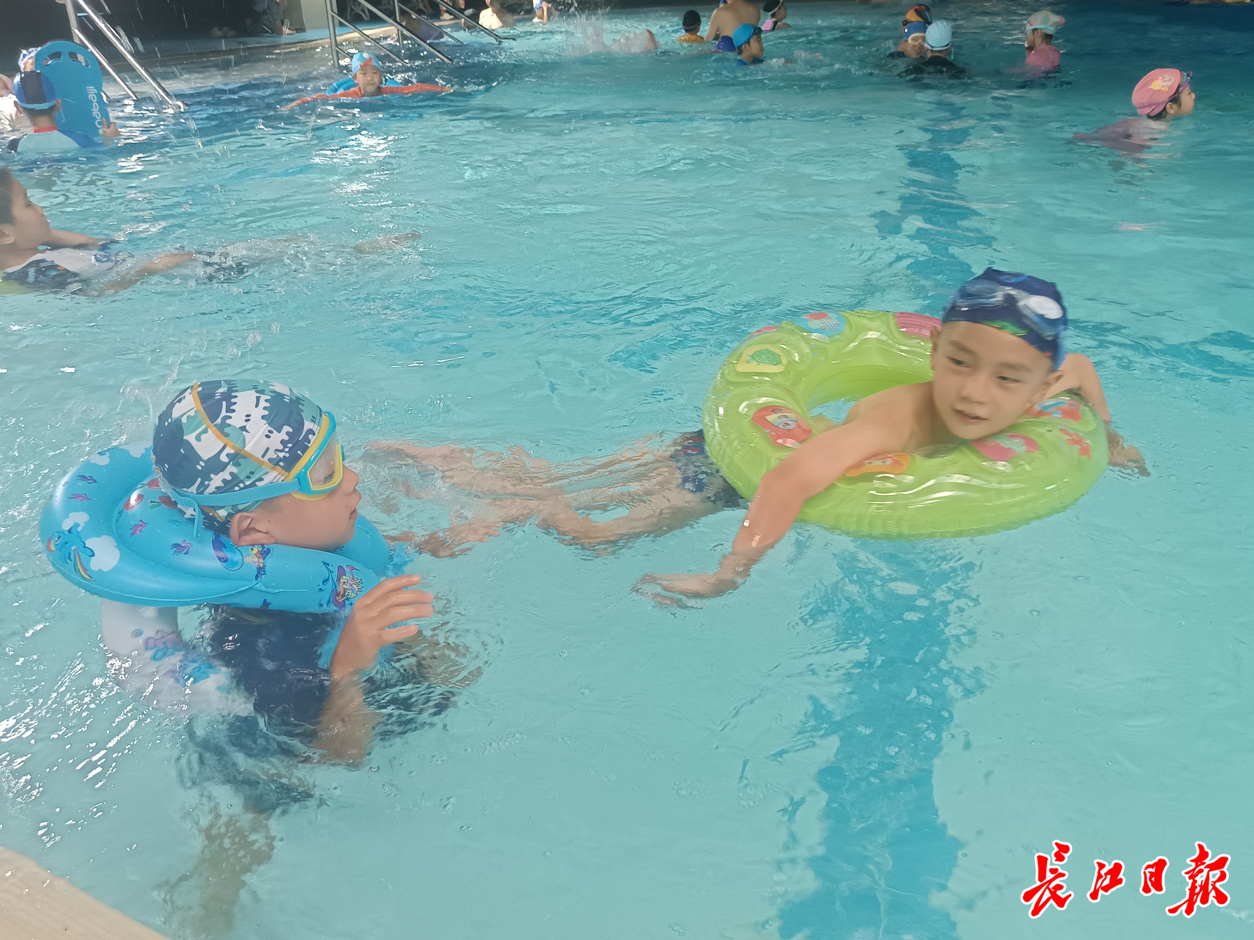 7月21日,在定点免费游泳馆之一的武汉全民健身中心游泳馆,长江日报记者看到,许多家长一大早就带着孩子凭预约码进场。游泳池中,孩子们在水中畅快地游泳嬉戏,家长围坐在泳池周围,安全员坐在高椅上认真值守,守护孩子们的安全。