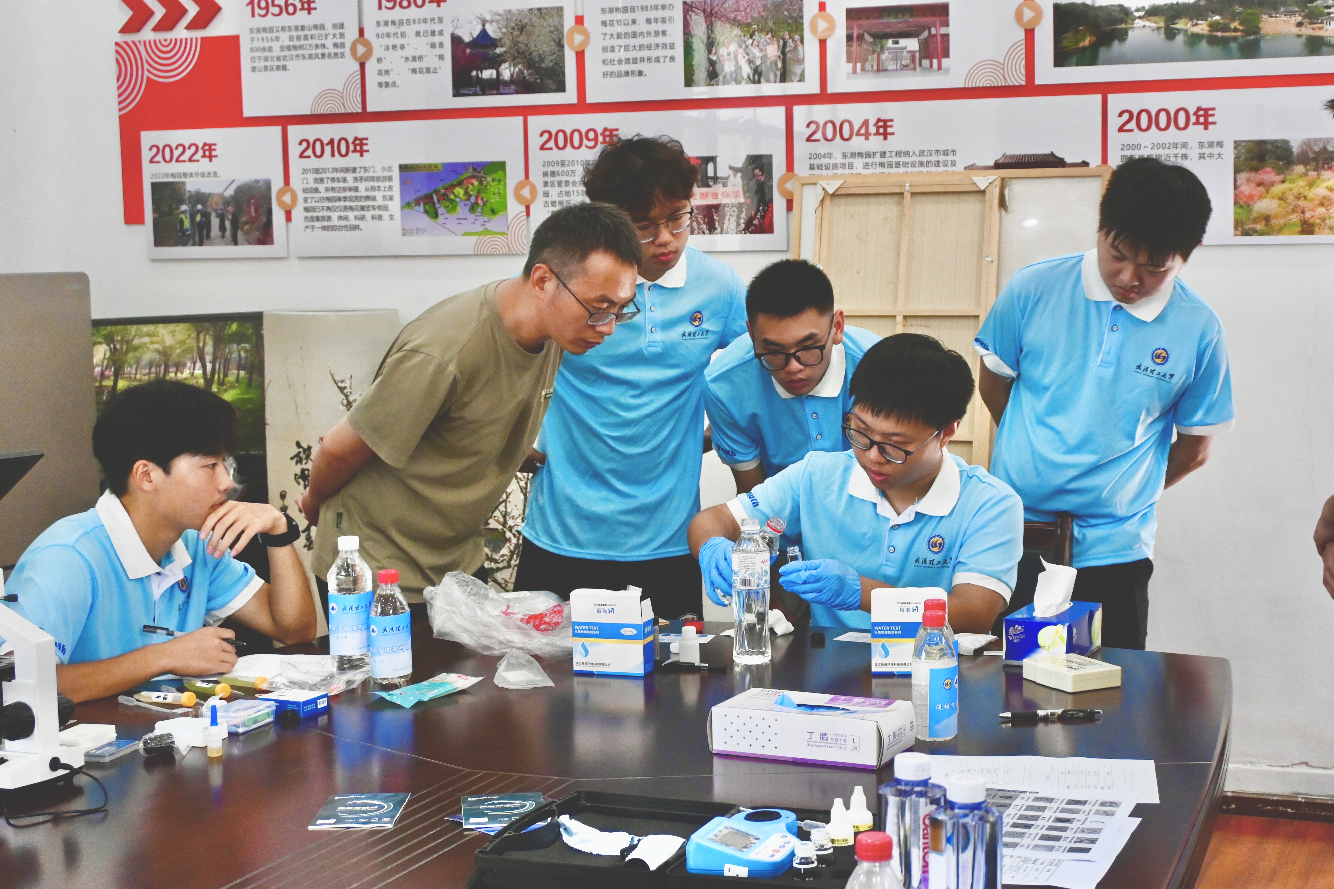 在水质检测实验中,华中农业大学生命科学院王教授讲解水质检测实验操作要点,并示范COD测定试剂、显微镜与载玻片的使用方法。“蔚蓝东湖”实践队员两人一组,进行水质检测实验,记录水样的氨氮值、总磷值和pH值。“对比一年前后东湖的水质数据,最直观的感受就是‘变化实实在在’,今年检测仪器显示的各项污染指标都比去年下降了近两成。”“蔚蓝东湖”实践队队员屈长海告诉记者。