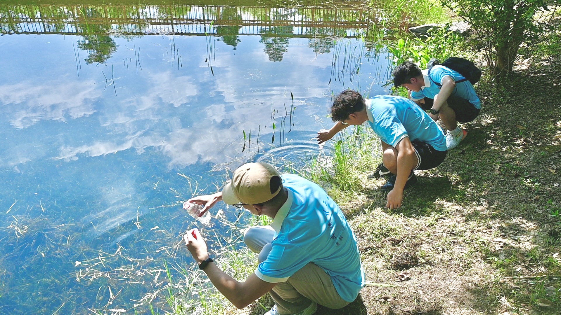 “蔚蓝东湖”社会实践队队员在华侨城湿地公园取水为水质检测试验做准备。姜霜月 摄