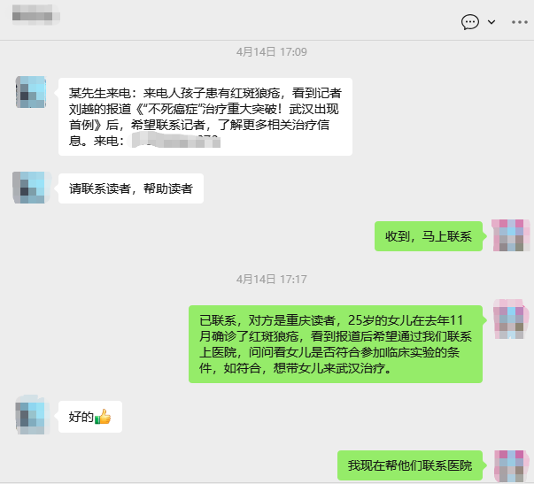 幸运的是,长江日报的热线电话顺利接通,工作人员将求助信息转给了记者,记者回电给小星爸爸了解清楚情况后,联系了武汉市第一医院风湿免疫科副主任、CAR-T治疗项目组负责人邹亮。“让他直接打我电话。”看到记者的留言,邹亮“秒回”信息,给出了自己的私人电话。