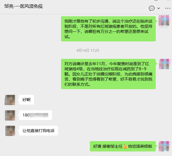 从4月中到6月初,加上邹亮微信的一个多月时间里,小星陆陆续续找邹亮咨询病情及CAR-T治疗五六次。最长的一次,通话半小时以上。邹亮副主任将狼疮目前所有的治疗手段、预后及相关病例情况事无巨细地介绍给了小星,并安慰她,这病没有网上说得那么可怕,规律治疗可以较好地控制病情。