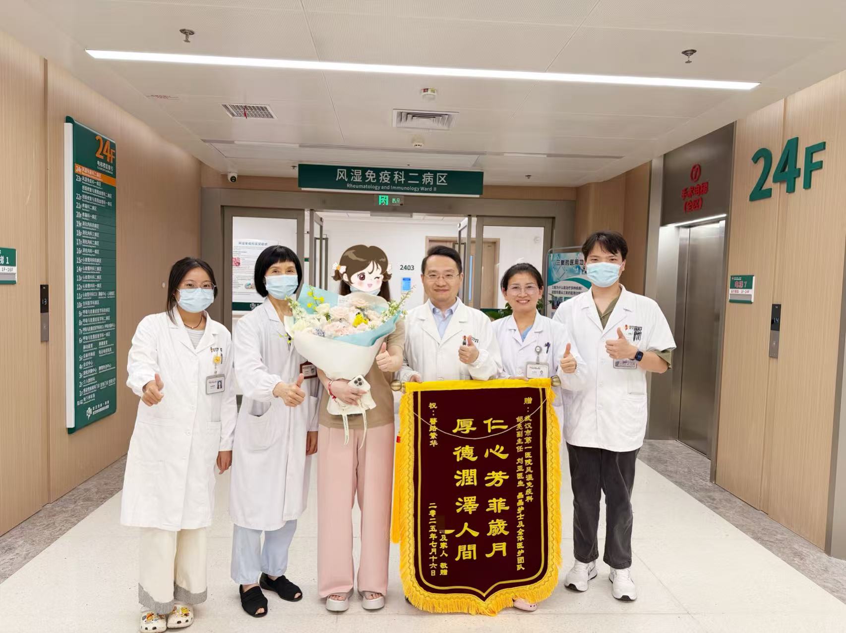 小星(左三)出院时给医护团队送上锦旗,并合影纪念。