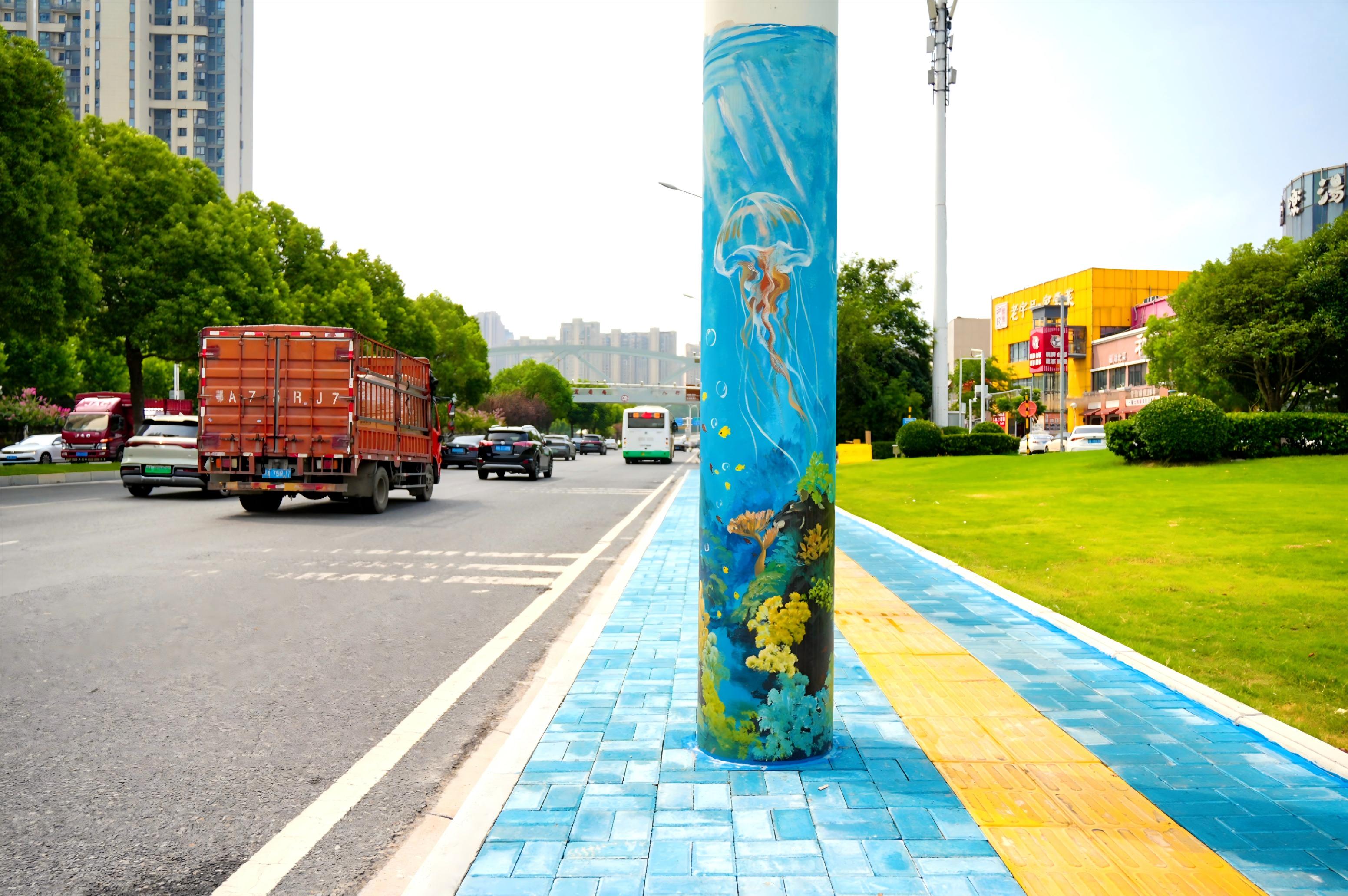 8日清晨,在宏图路与金银潭大道交会处,近期经改造后的道路焕然一新,人行道上栩栩如生的海豚彩绘仿佛在“游动”,紧邻武汉极地海洋公园的人行道、箱柜和路灯杆上,也绘制了灵动的蓝色海豚、热带鱼等艺术涂鸦。这些彩绘图案在保留盲道功能的同时,巧妙融入海洋元素,不仅提升了道路的美观度,也为步行市民带来别样的愉悦体验。