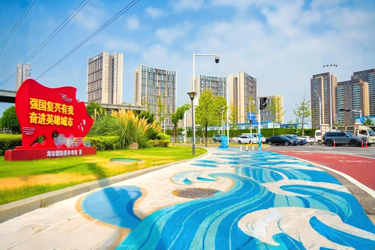 长江日报大武汉客户端8月8日讯 “现在每天上下班经过宏图路,都像在画中穿行!”8月8日,在武汉客厅附近工作的市民张静指着地面蓝色波浪纹样步砖不禁赞叹。