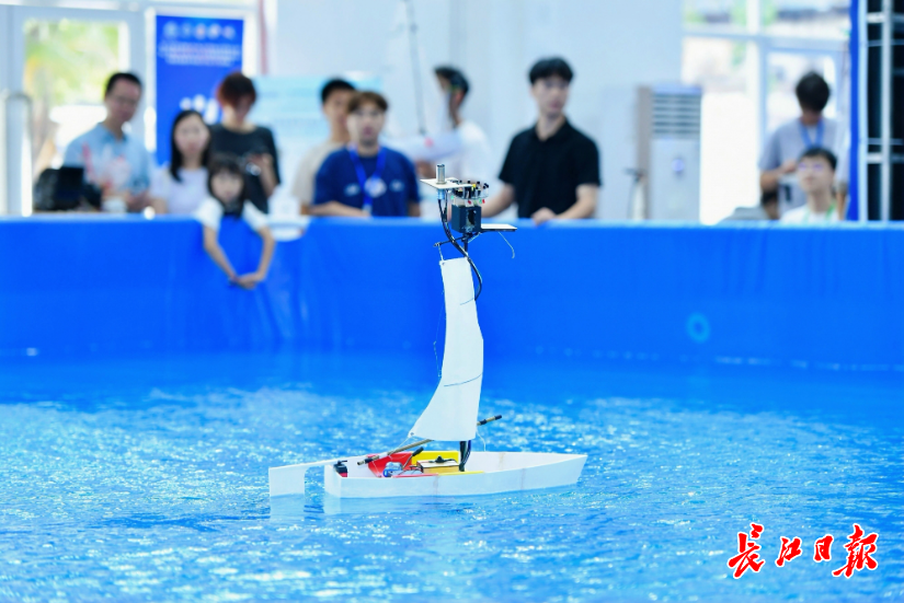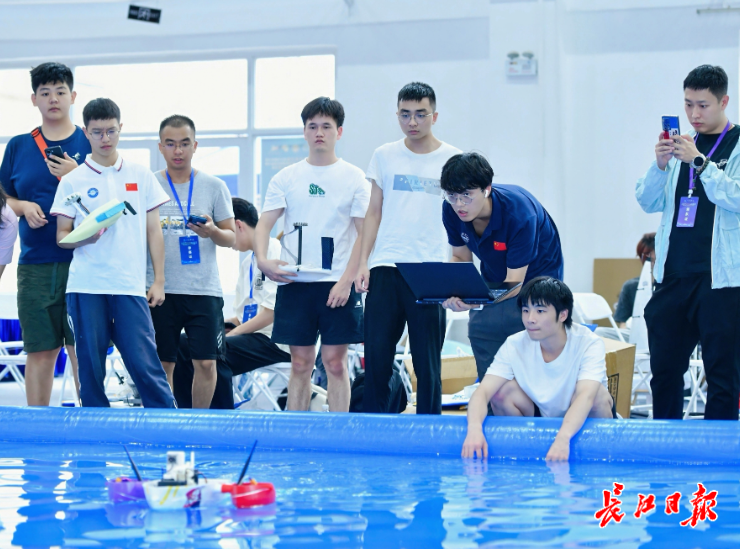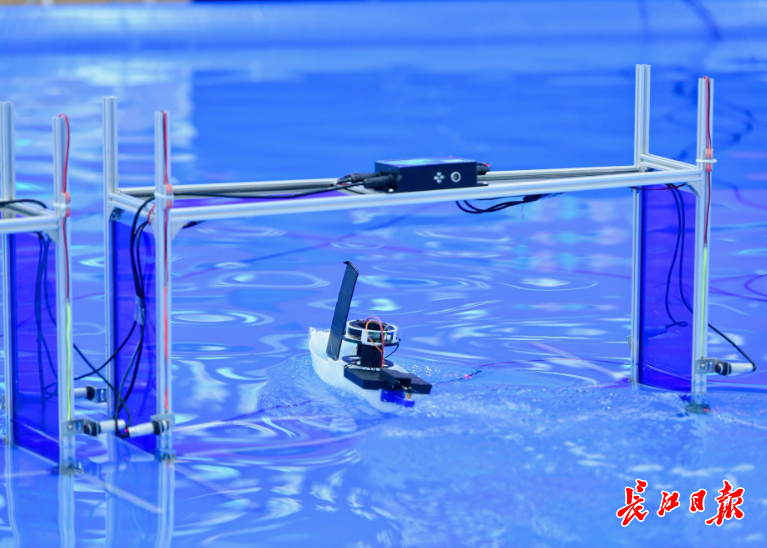 而距此百米外的武汉理工大学船舶操纵水池内,水波轻漾间,此次大赛的另一个项目正火热进行。参赛作品分为水面、水下两组,选手们带着精心打磨的“利器”在此一较高下。水面上,各式航行器破浪驰骋;水底下,潜航设备悄然穿梭,一举一动都吸引着评委与现场嘉宾的目光,生动展现着海洋装备的多样技能与前沿科技。