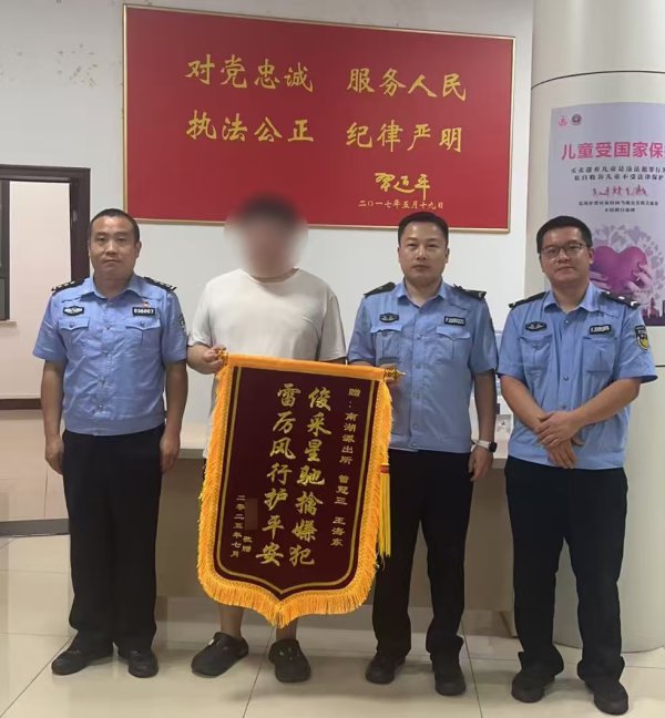 潘先生(左二)给民警送锦旗。 通讯员陈科先 摄