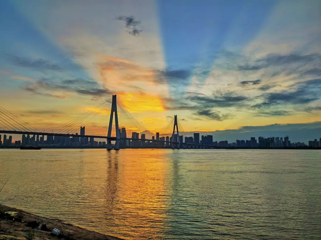 傍晚,青山江滩秋风送爽,落日余晖散射向苍穹,透过二七长江大桥的斜拉索倾洒在江面,波光里糅着橙黄与靛蓝的色块,如同油画一般,把江城的浪漫,悄悄藏进了初秋的暮色里。