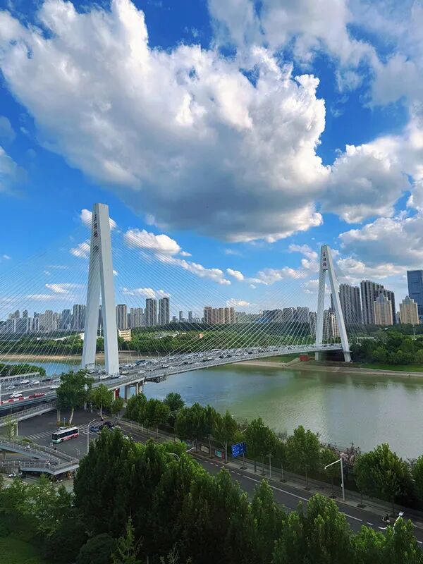 微风正好,阳光不燥,天空湛蓝,大团的白云,触手可及。就像施了魔法一般,会变幻出各种各样的形状。江面上斜拉索月湖桥横亘江面,仿佛一枚巨大的竖琴,直插云霄。桥面上车辆川流不息,像是按下了快进键,奏响了城市的夏日交响曲。