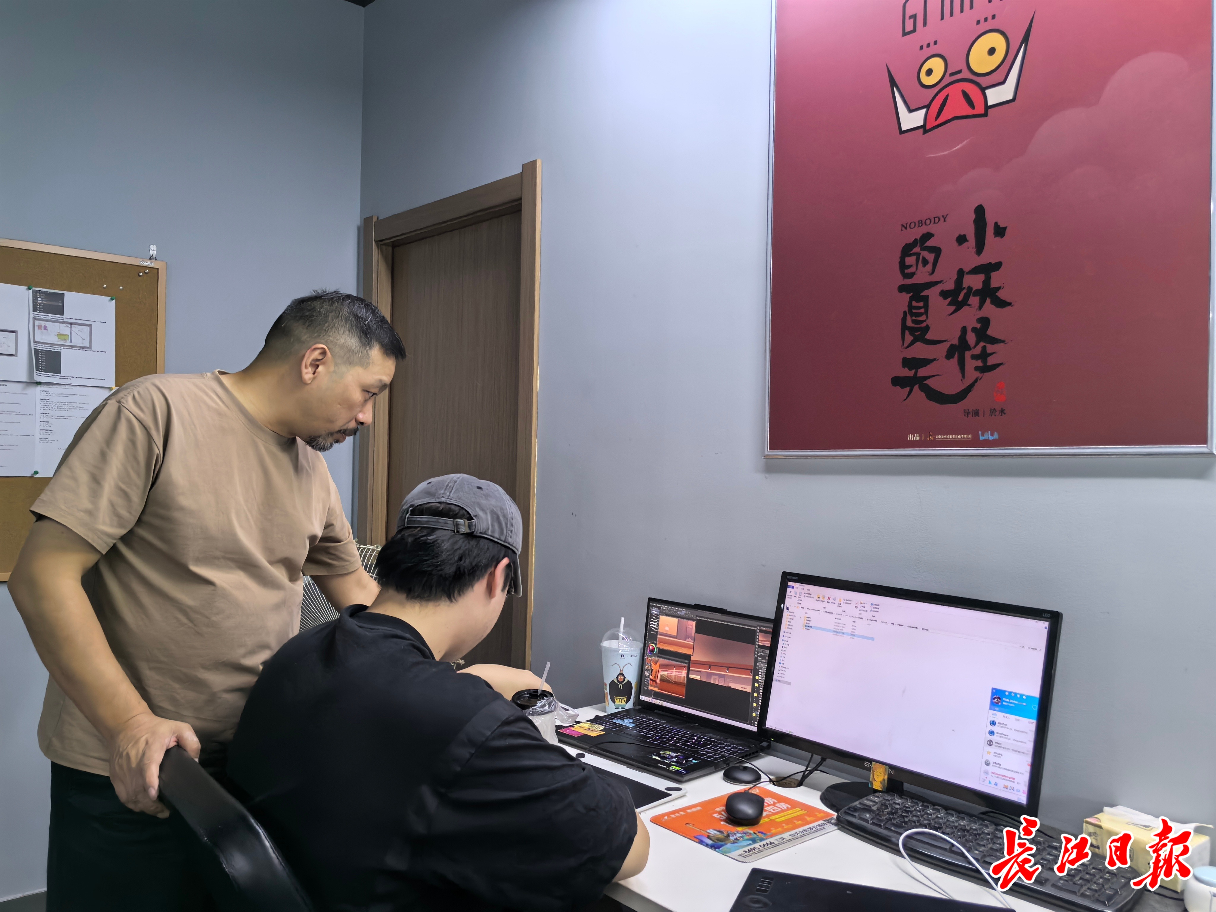 走进位于武汉经开区的武汉同美文化传媒有限公司,办公区的墙上贴着《浪浪山小妖怪》中的人物海报。公司负责人李军正在指导画师为动画《非人哉》番剧制作画面。因《浪浪山小妖怪》爆火,同美文化接到的合作项目也逐渐增多。
