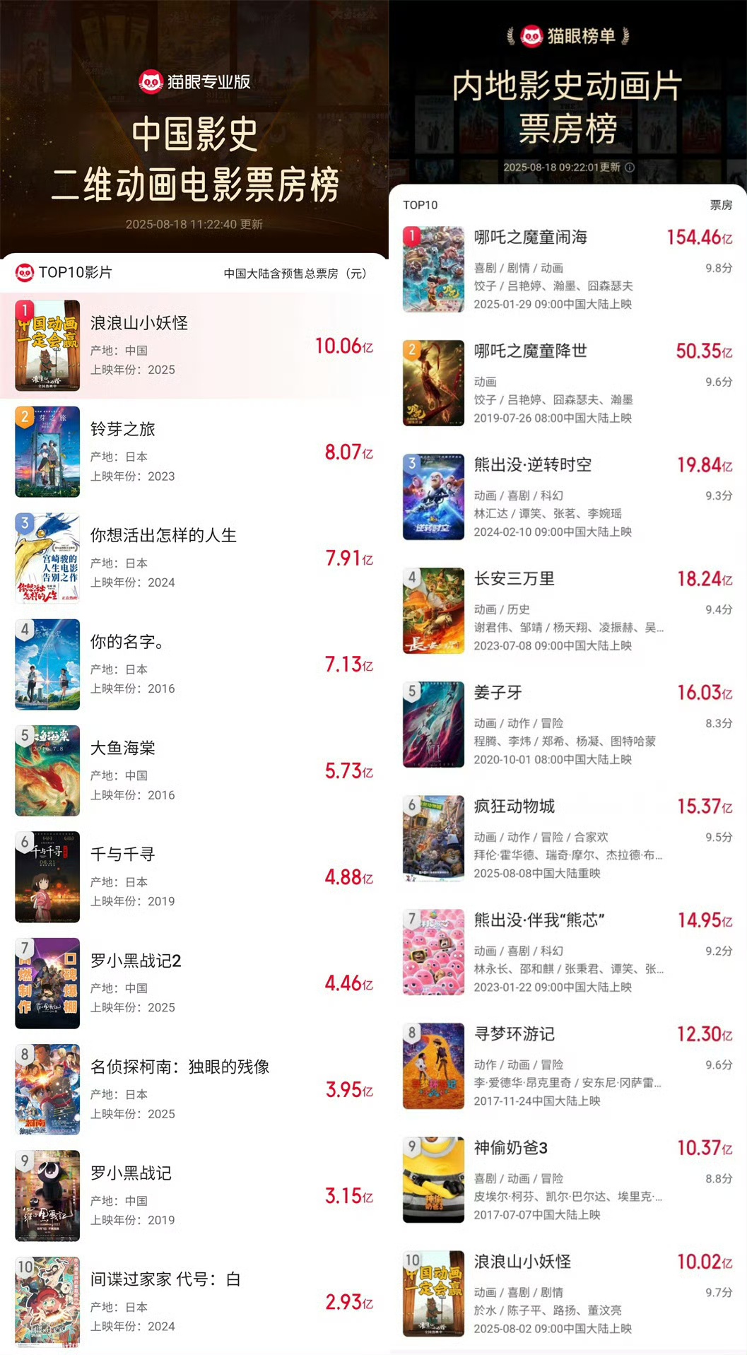 《浪浪山小妖怪》成为中国影史二维动画电影票房冠军。