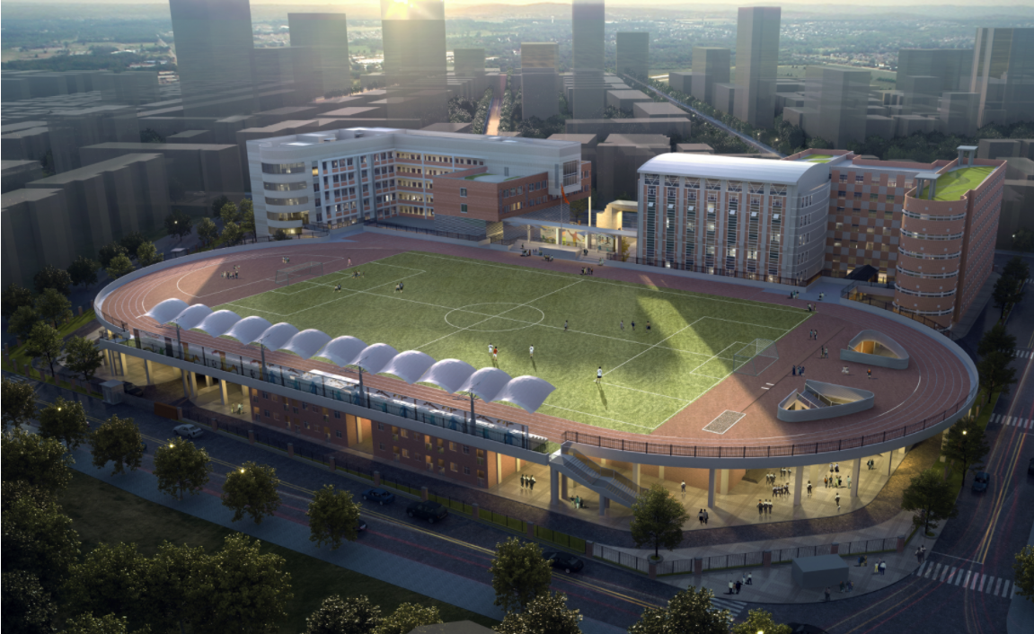 新学期,师生们将在校内的立体运动场上开展体育运动。新运动场“地面下沉、首层架空、多层运动环”设计,配备室内五人制足球馆、足球体能训练康复室、足球战术室、百米风雨跑道、篮球场、羽毛球场、乒乓球场等,“屋顶球场”设置400米环形跑道、主席台、看台等标准化体育设施。