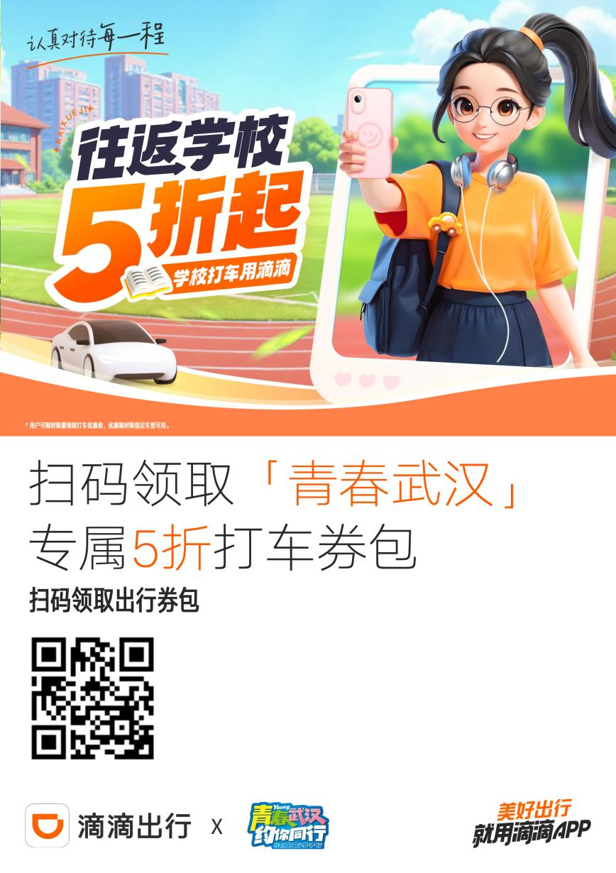 长江日报大武汉客户端9月5日讯(记者刘克取 通讯员武小青)9月,武汉迎来超过30万名大学新生。今日记者获悉,为打造沉浸式迎新体验,团市委联合滴滴出行推出专项福利,即日起至9月30日,师生通过扫码即可领取专属出行券包,内含两张5折打车券和两张5元立减券。只要行程起点或终点在指定高校校区范围内即可使用,单笔最高可优惠50元。