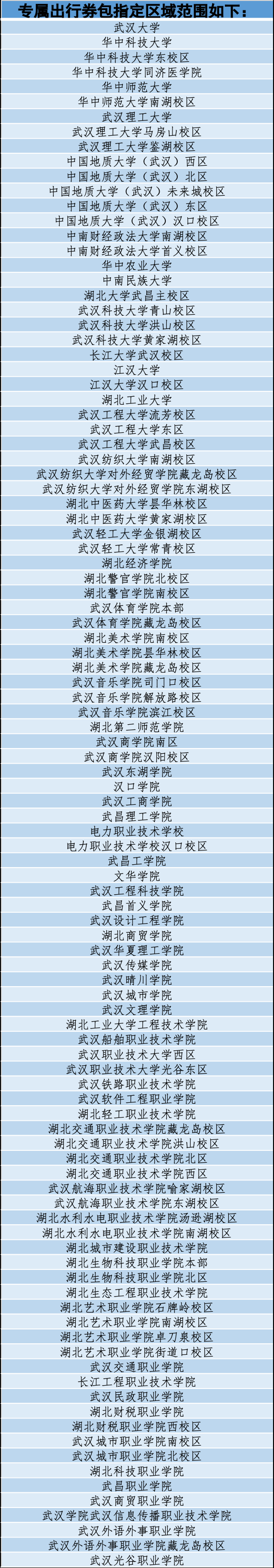 记者了解到,本次优惠活动共覆盖全市82个高校校区。华中科技大学、武汉理工大学、华中师范大学,中国地质大学(武汉)、中南财经政法大学、华中农业大学、江汉大学、武汉商学院、武汉软件工程职业学院、武汉城市职业学院等高校校区均在指定区域范围内,真正实现“一券通达”。