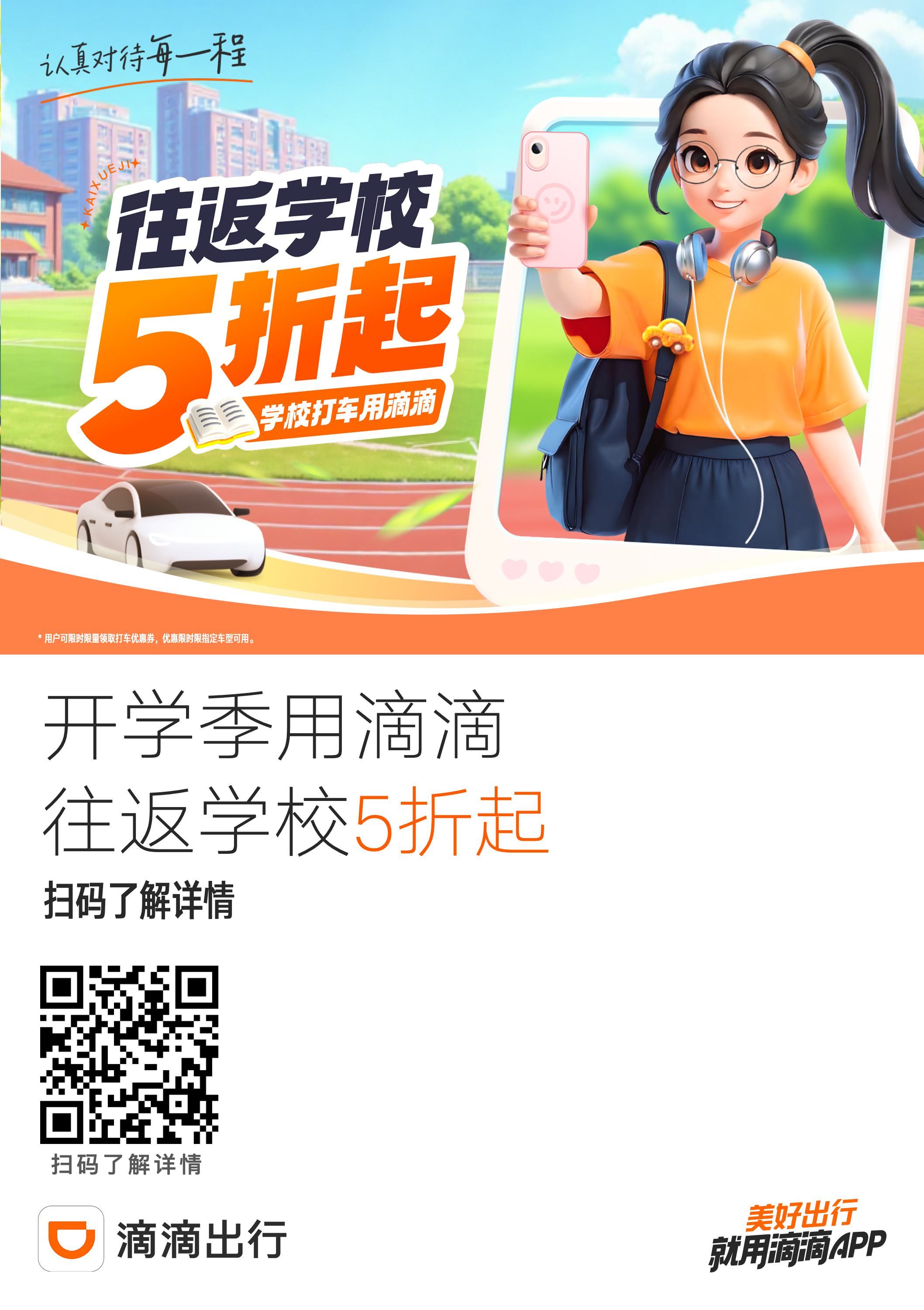活动期间,师生可通过扫描二维码领取券包,每7天可领取一次,每日券包限量发放,领完即止。所领券项限7天内使用,适用于滴滴快车与特惠快车,具体使用规则可在滴滴出行App“我的卡券—优惠券”内查看。