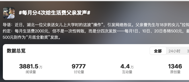 对于全网关注的“每月分4次给生活费”的发放方式,曹爸爸说:“等孩子适应环境了,肯定会给她自主权!”他解释,目前分4次发放只是过渡方案:刚开学两天就花了500块,要买的东西多。但最终目的是培养她的理财能力——要知道500块撑10天,就得学会规划每日开支。最终,他慢慢放手,将每月生活费一次性交给孩子。