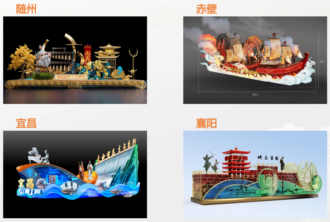 6台主题花车,分别为“河山锦绣”“初心如磐”“楚风汉韵”“非遗国潮”“动漫萌宠”“全球狂欢”;14台品牌花车,涵盖湖北省多个市州及地区。
