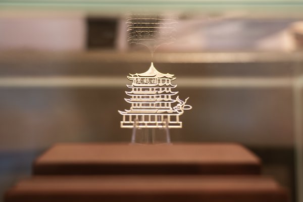 馆内展出了一件采用激光切割技术、用金属板制成的微型黄鹤楼只有2指宽、3指高,厚度不足1毫米,堪称一件别致的艺术品。