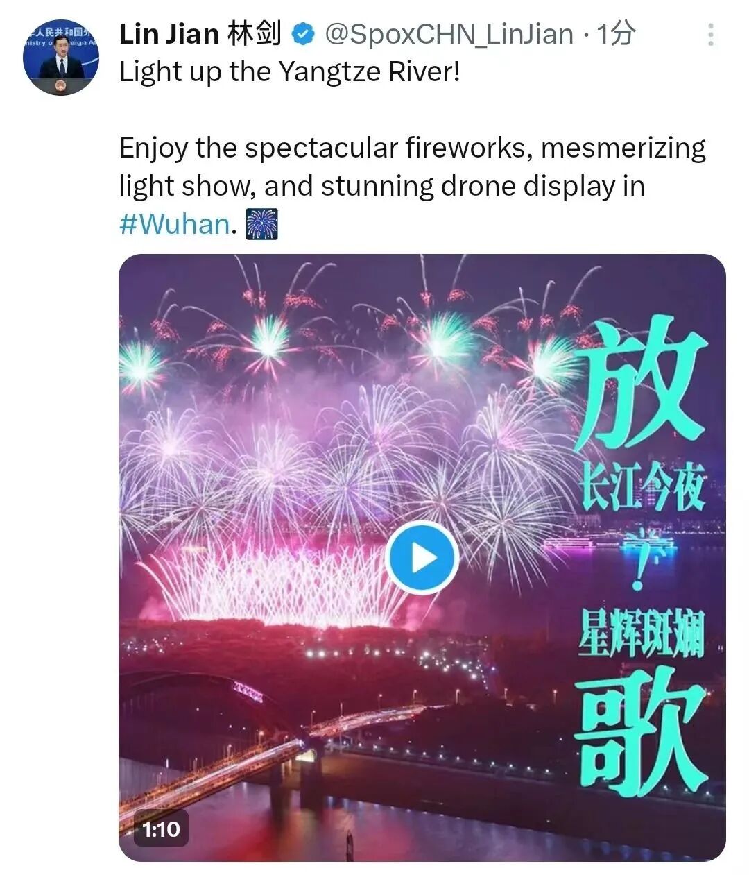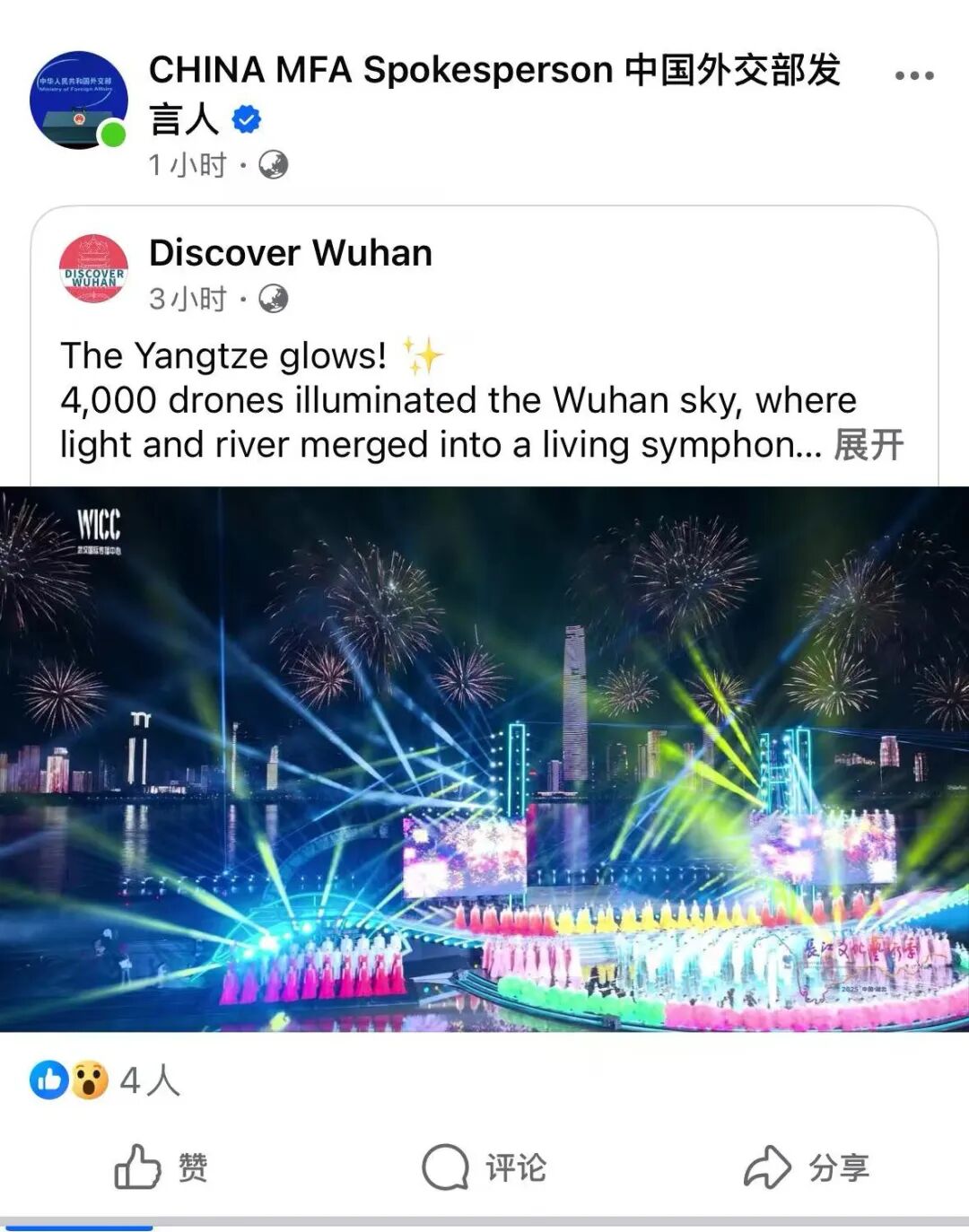 外交部发言人去年转发《放歌!长江今夜星辉斑斓》截图
