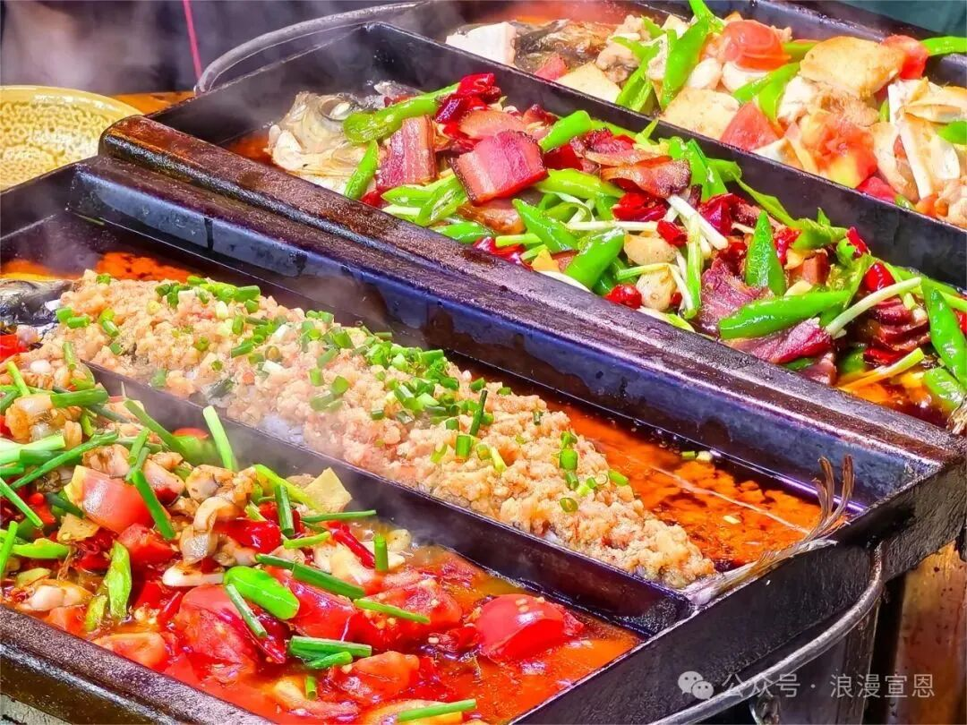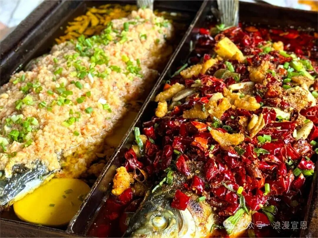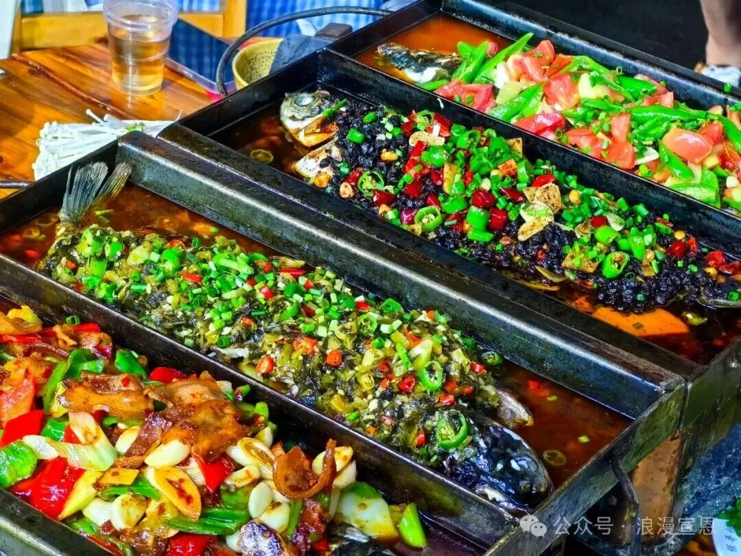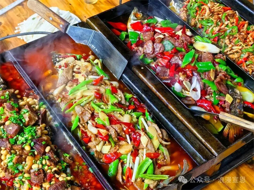 活鱼现杀,炭火慢烤出灵魂,鱼皮金黄焦脆、鱼肉鲜嫩多汁,淋上秘制酱料,香辣滋味瞬间迸发。铁板滋滋作响,配菜吸饱鱼鲜与酱香,一口鱼一口菜,是宣恩独有的山野美味。