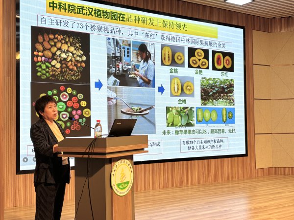 钟彩虹研究员给市民讲解猕猴桃知识。中国科学院武汉植物园提供