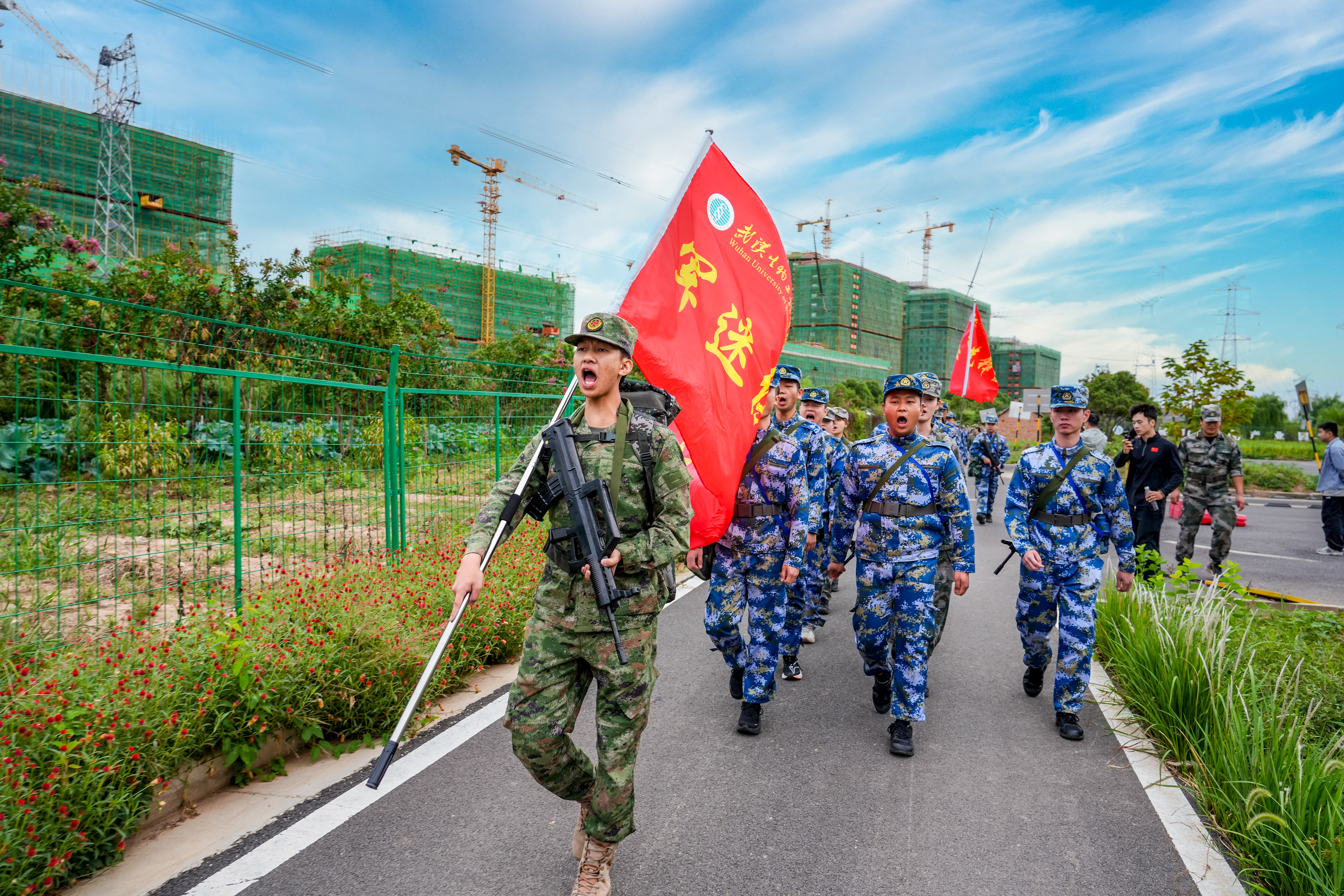 这支由132名2025级新生代表组成的“自强先锋营”,在该校马克思主义学院教师和辅导员代表、军迷俱乐部成员的陪同下,身着统一戎装,肩挎行军水壶,精神昂扬地从校内静思园浩荡出征。队伍蜿蜒如龙,途经智汇农场、阳逻街新堤村、武湖水库大堤,最终抵达蔡漖基地,全程约百里。