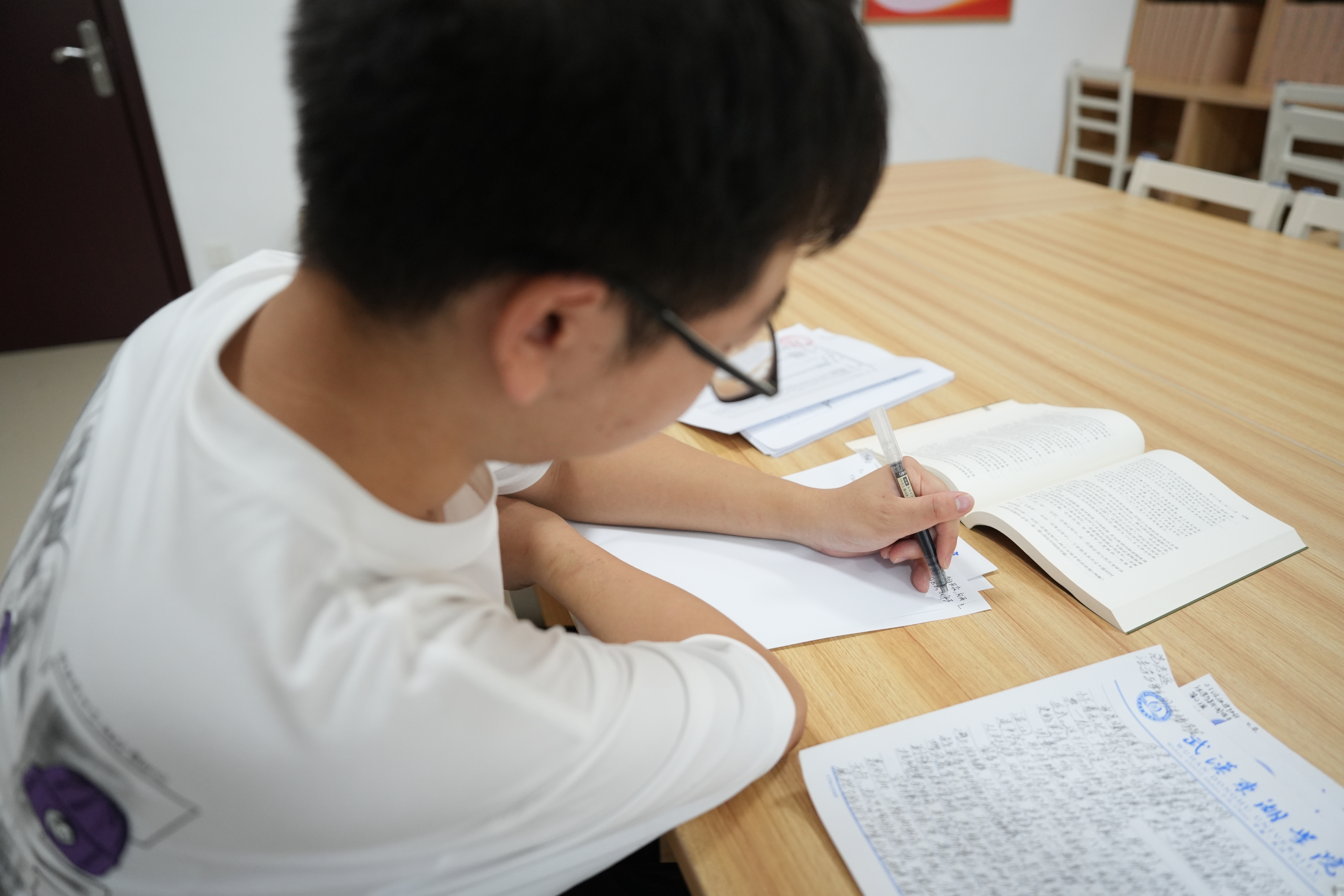 9月24日,武汉东湖学院图书馆,24岁的新闻学专业学生胡邈专注俯身案前。留着一头利落的短发、戴着黑框眼镜的他,用左手执笔,一笔一画誊抄着前几日的散文随笔手稿。