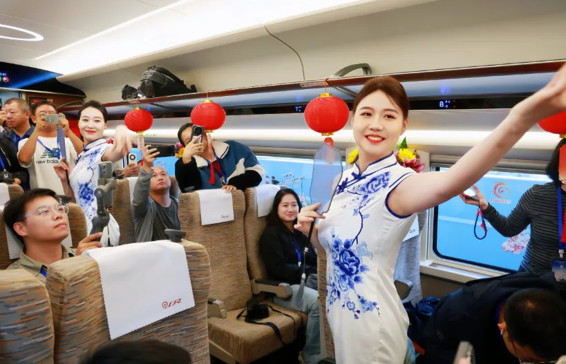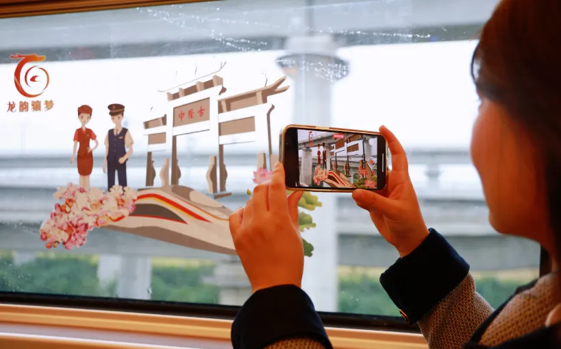 车厢内,首发之旅热闹非凡。国风旗袍舞《青花瓷》赢得阵阵掌声,身着“楚韵”服装的乘务员表演《乐享龙韵骧梦》礼仪舞,传递荆楚文化魅力;知识互动问答、集章打卡、文创印章环节让旅客笑声不断。
