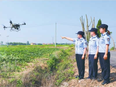 金口派出所“枫警娘子军”在村湾小路用警用无人机开展巡查。江夏公安供图