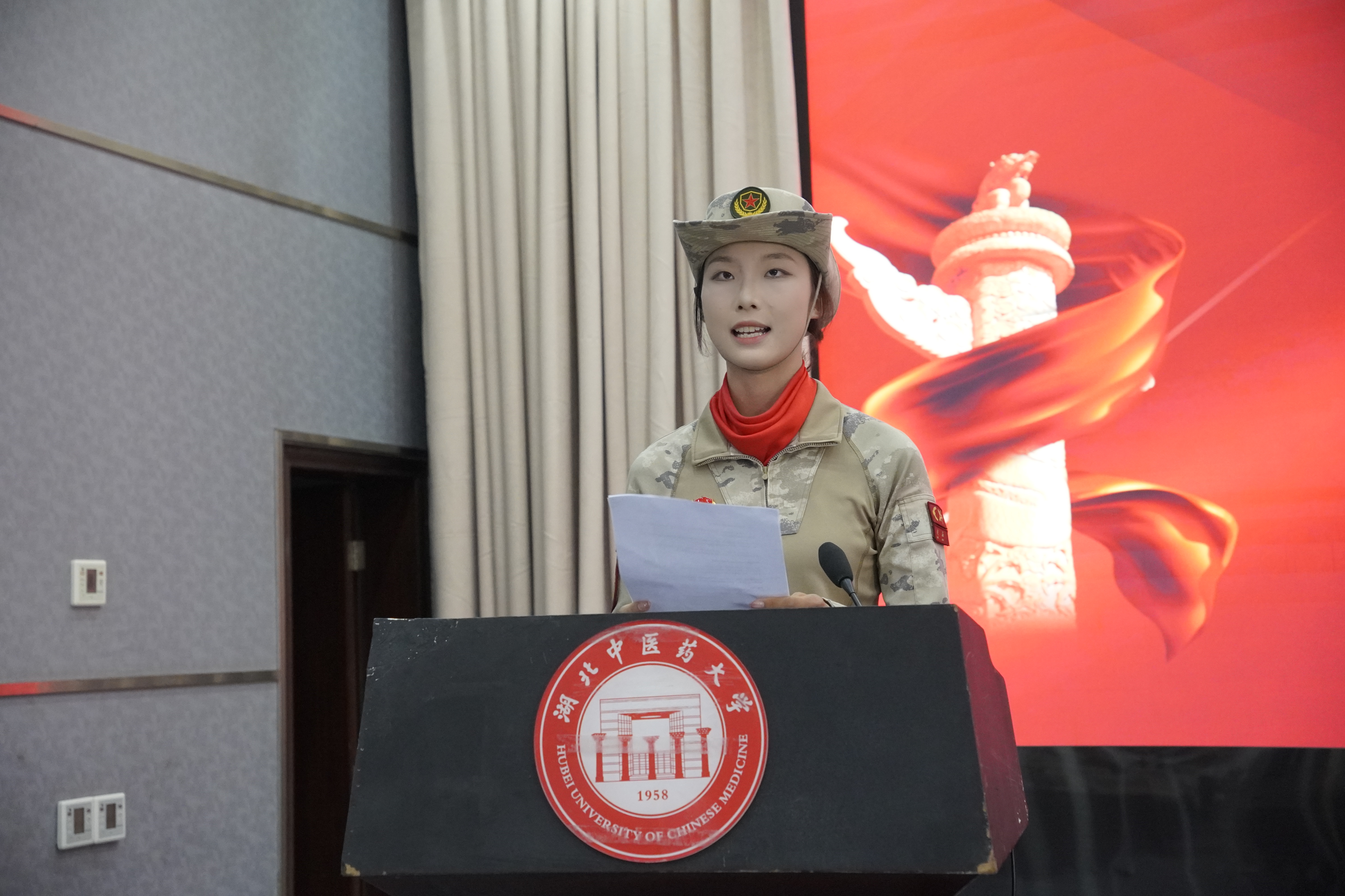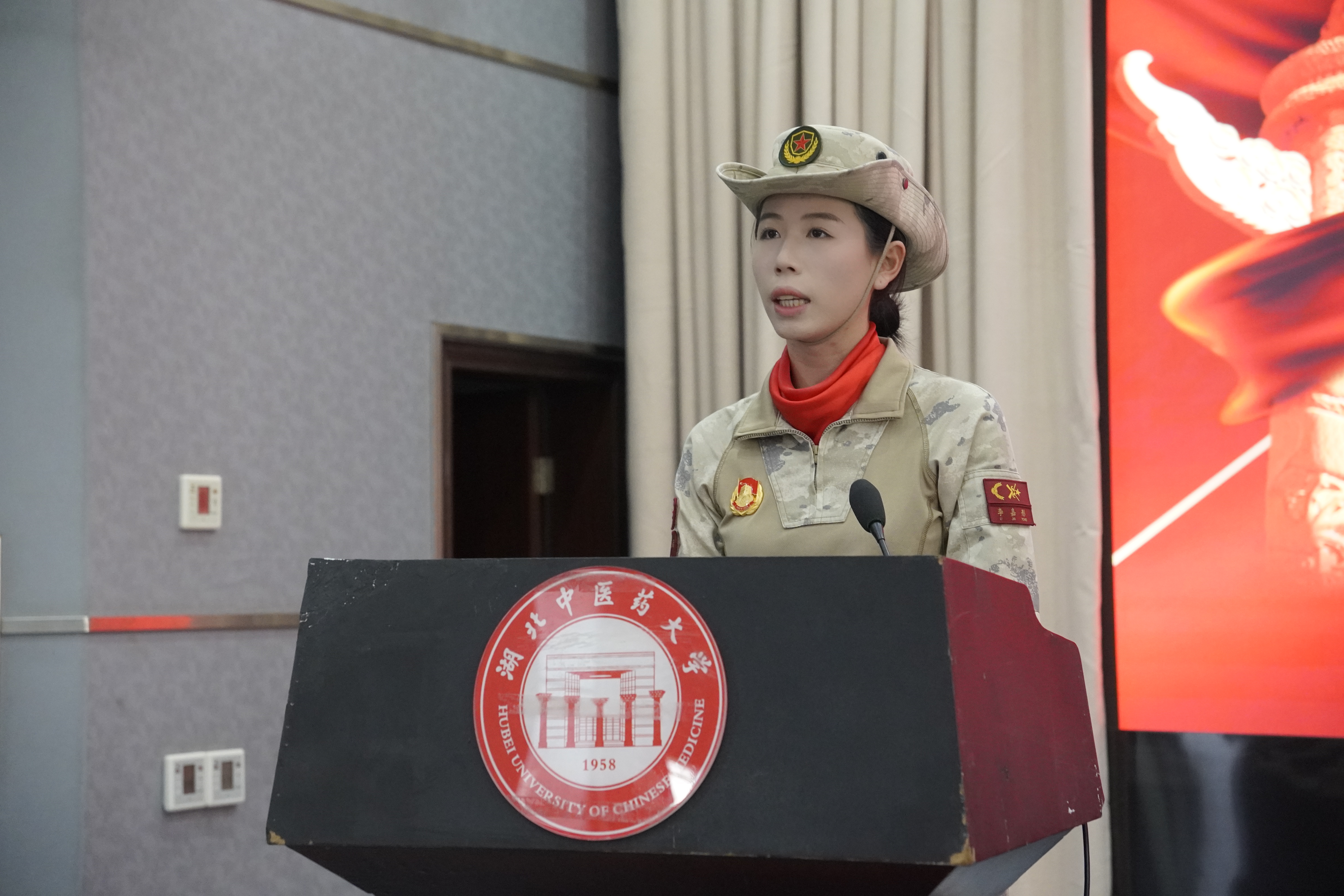 “当我身着参阅制服,迈着整齐步伐走过天安门广场,自豪感与使命感难以言表。从训练场的精益求精到长安街的万众瞩目,我深切体会到:个人力量微小,忠诚于党和人民的事业,就能迸发惊人能量。”2024级针灸推拿学专业学生李嘉彤的分享,让报告厅瞬间安静下来。作为“九三阅兵”女兵方阵成员,她回忆起从军营到校园的转变。