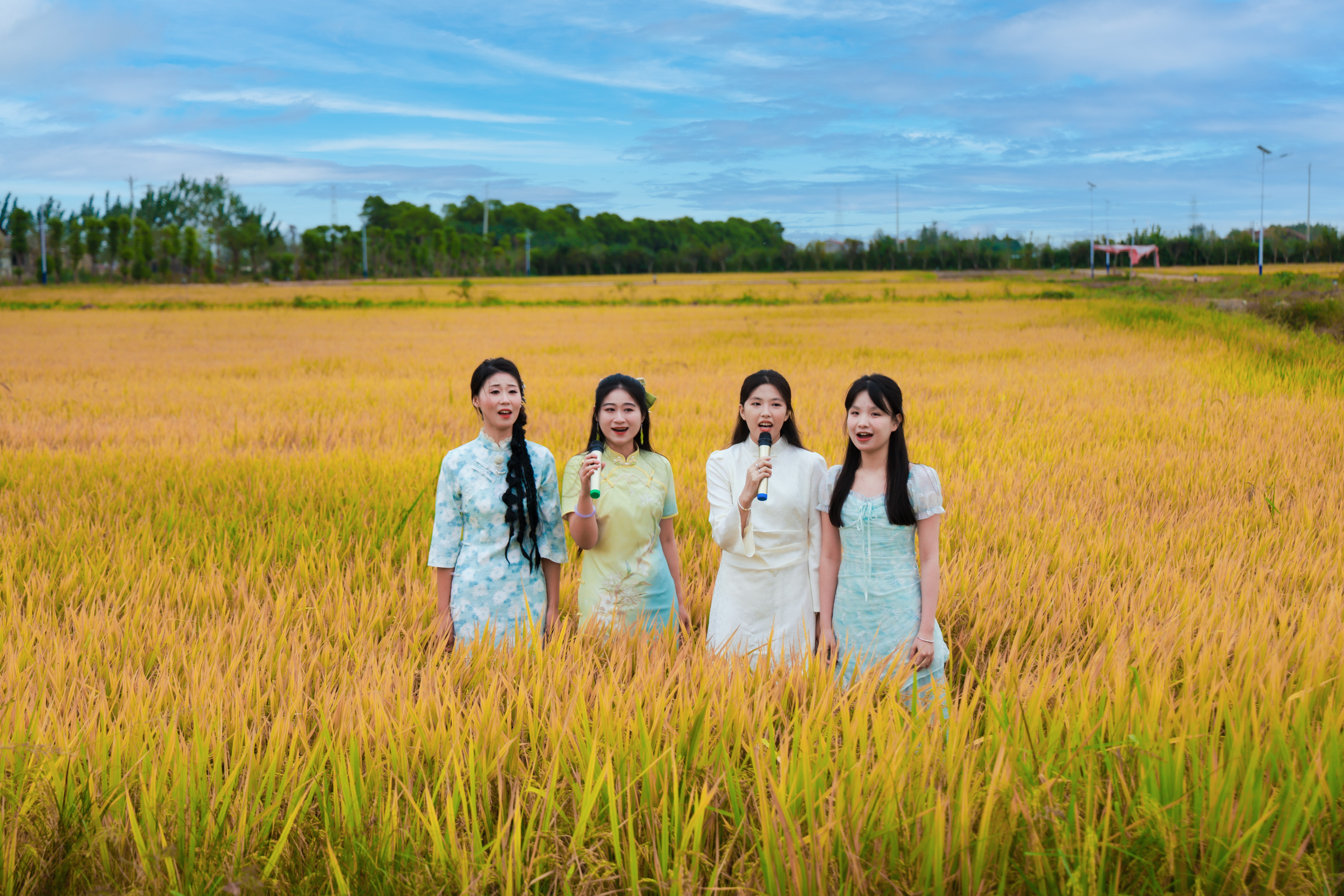 音乐学院师生在稻田旁演唱《在希望的田野上》。