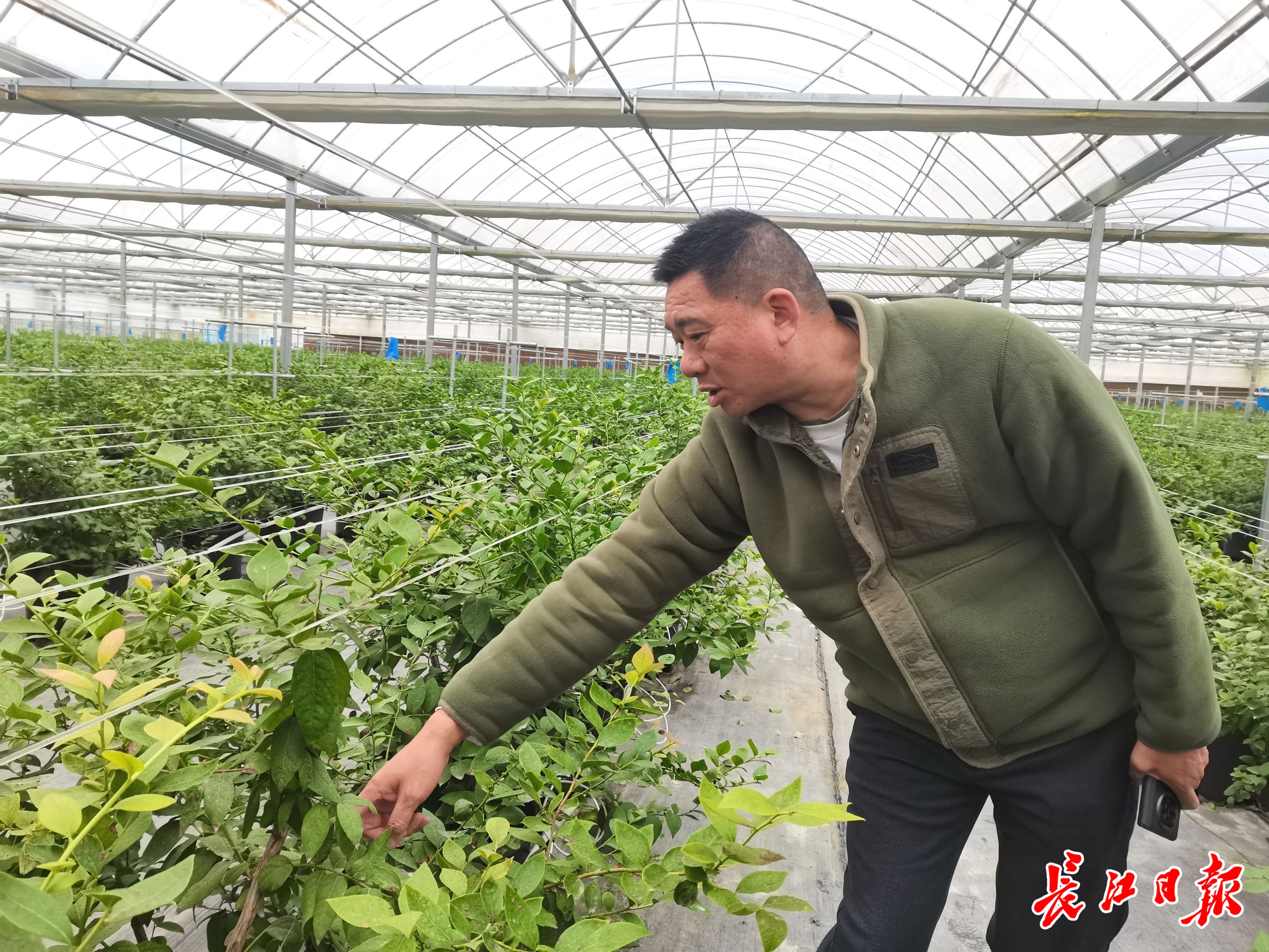 杨卫国在大棚蓝莓基地查看。记者汪文汉摄