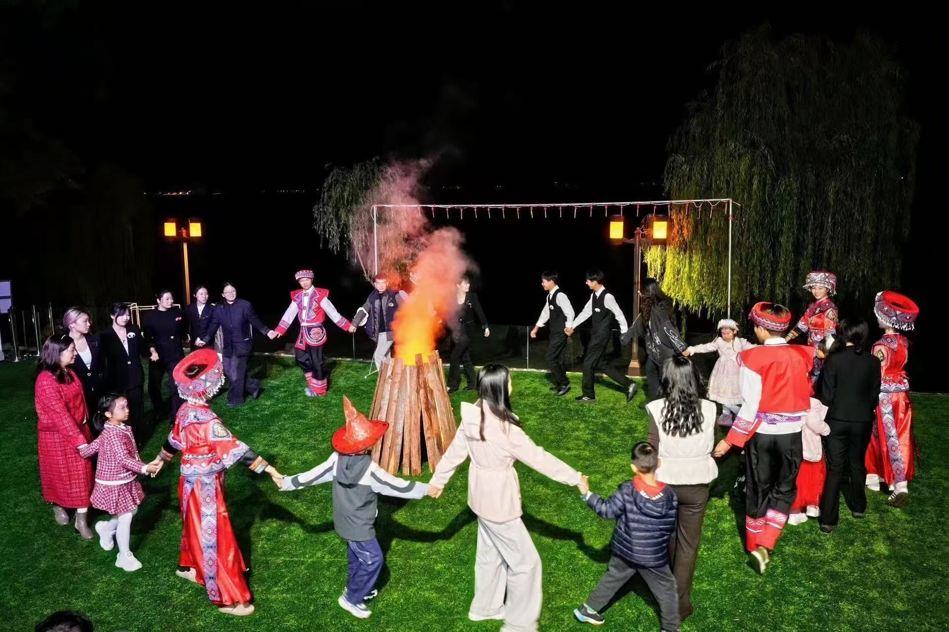 晚8点,随着一声悠长的口令,主舞台中央的“电子篝火台”瞬间燃起橘红色的“蒸汽火焰”,跃动的火光如金蛇狂舞,篝火晚会正式开启。餐厅湖畔广场上,篝火熊熊燃起,土家族艺人身着传统服饰,带领宾客跳起摆手舞。随着鼓点节奏,众人手拉手围成圆圈,舞步由缓至急,现场气氛逐渐升温。
