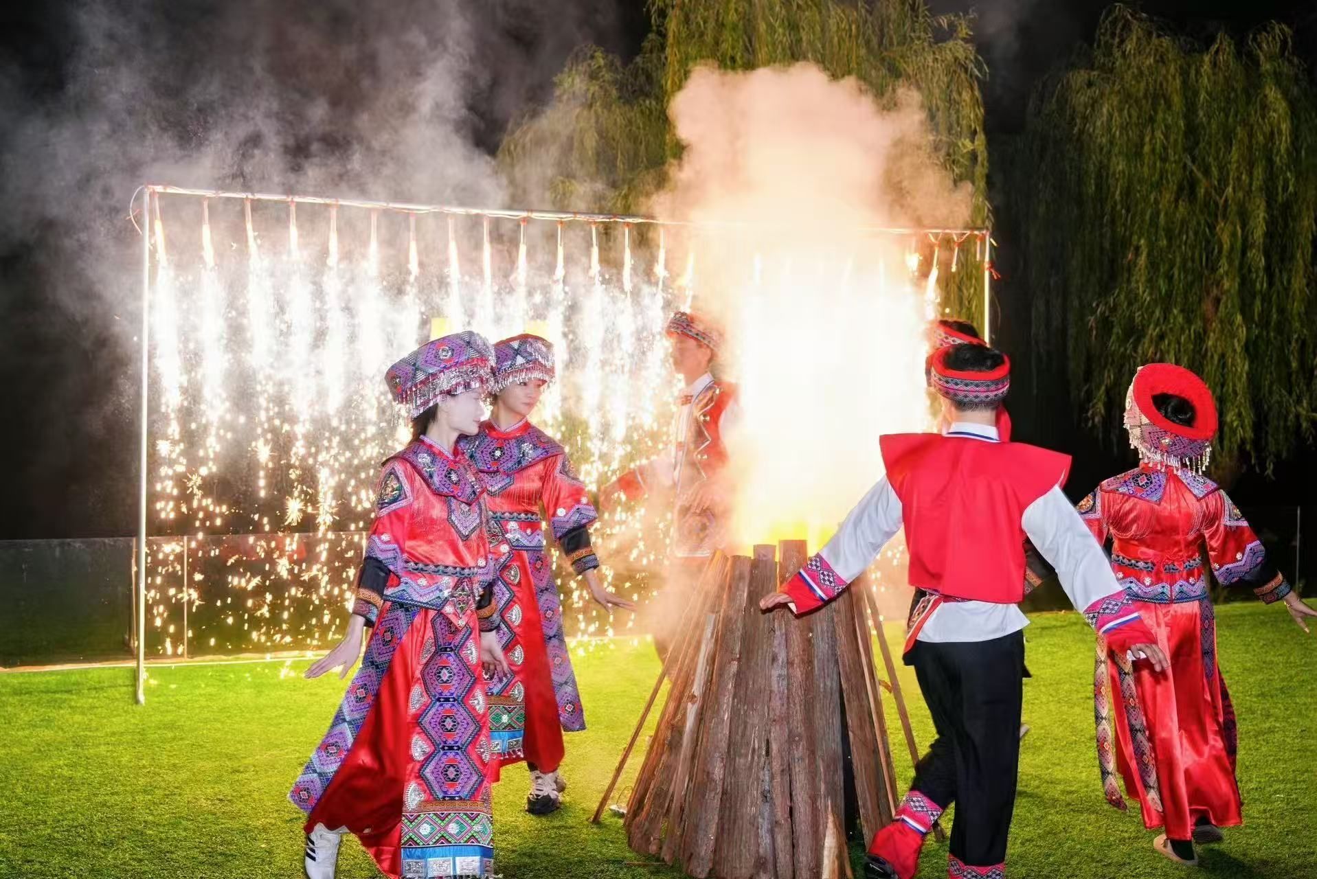 歌舞狂欢,意兴阑珊时,烟花背景墙喷射出密集的金色火花,形成一道宽约数米、不断跃动的光瀑。无数灼热的火星迸发四溅,伴随“嘶嘶”声响,在夜幕中划出万千流光,将环绕篝火起舞的民众身影勾勒得清晰明亮,翻飞的民族服饰彩珠与火花交相辉映,为这场传统庆典注入了蓬勃的现代活力。