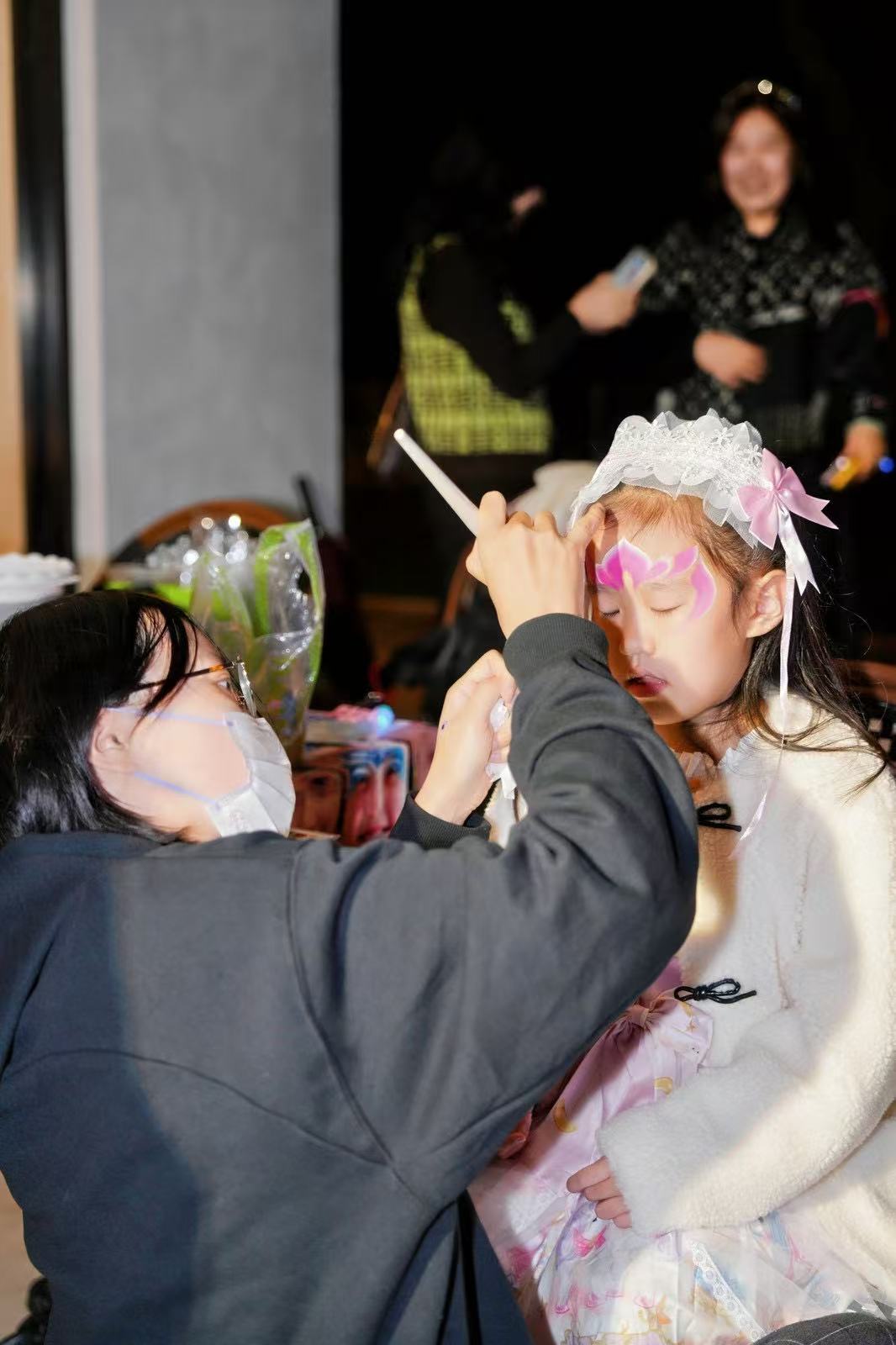 晚7点,活动还未开始,面部彩绘区已簇拥起许多宾客。化妆师们手持彩绘笔,在宾客脸上施展“魔法”。一位刚完成凤凰图腾彩绘的小朋友兴奋地指着自己的脸颊:“这个会发光的图案是魔法师的守护符号!化妆师姐姐说我今晚会获得魔法力量,太酷了!”透过镜子看到自己的新妆容,孩子们欢呼雀跃,仿佛瞬间化身为童话故事中的角色。