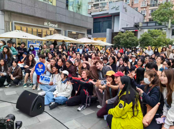 第十四届琴台音乐节重磅项目法语原版音乐剧《莫里哀》主演在花园道与市民游客合影。 记者晋晓慧 摄